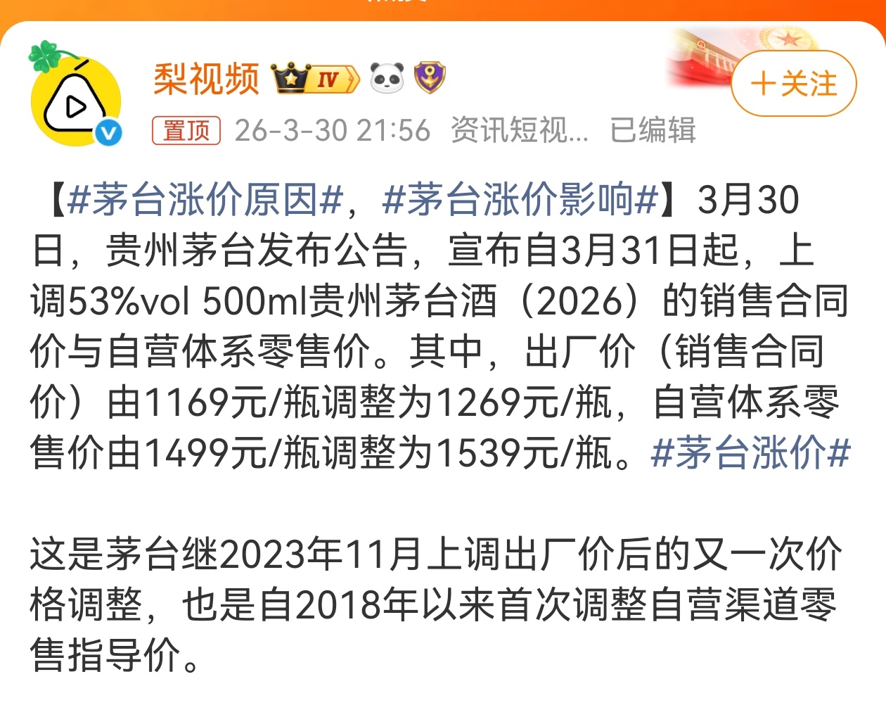 茅台发布重大事项公告 昨天就注意到了,此次茅台涨价是建立自营体系零售价格“随行就市”,动态调整机制后的首次实施。