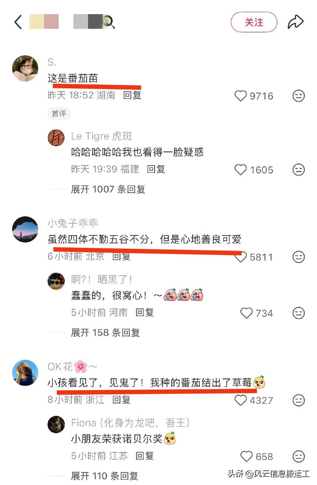 网友发帖,邻居小孩种的草莓苗,给他放了几颗草莓,草莓要下市了,估计长不出来了,提前帮他实现梦想 重点来了,本来这是一个温暖的故事,结果评论区,这不是草莓这是番茄,虽然你四体不勤五谷不分,但是你心地善良[呲牙]