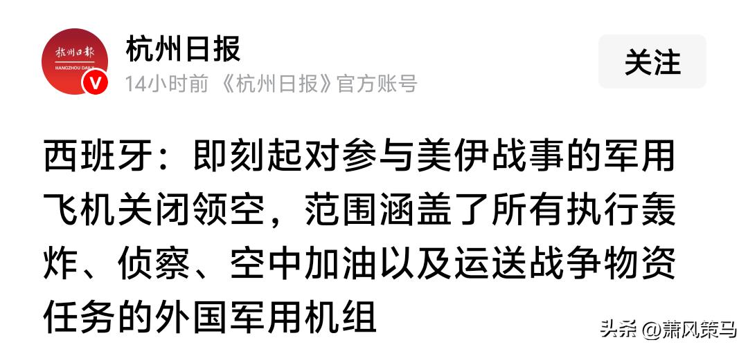 突发!3月30日西班牙直接甩出重磅决定,内阁紧急会议一拍板,当即对所有参与美伊战事的外国军用飞机关闭领空,半点不带拖泥带水! 不管是执行轰炸、侦察的战机,还是负责空中加油、运战争物资的支援机组,全被拒之门外。西班牙明着说,这么做就是要守国际法、防冲突升级,更是要护住自家安全。 要知道,敢直接拦美国相关军机的欧洲国家可不多,西班牙这波操作堪称硬核,直接打破了欧洲以往的沉默态度,地缘格局的微妙变化,这下藏不住了!