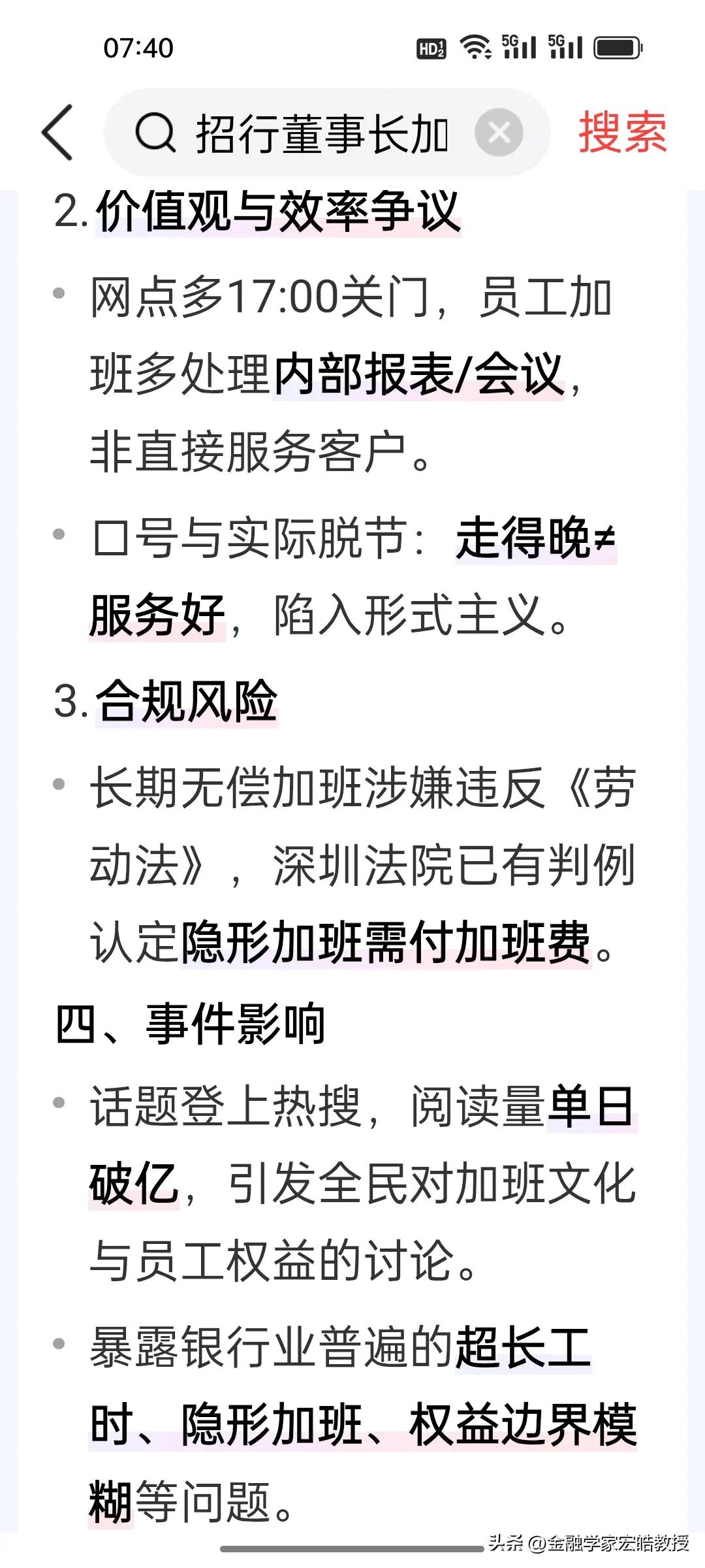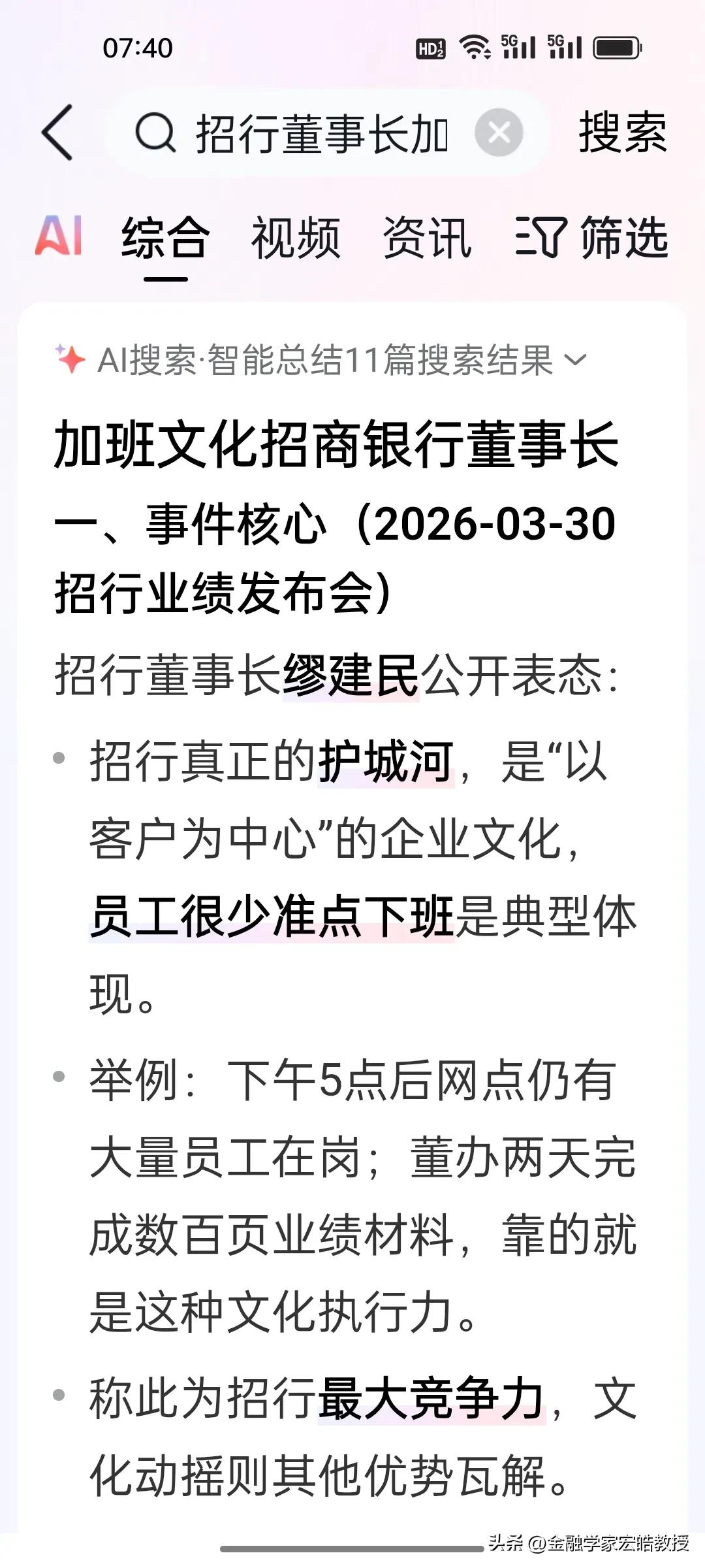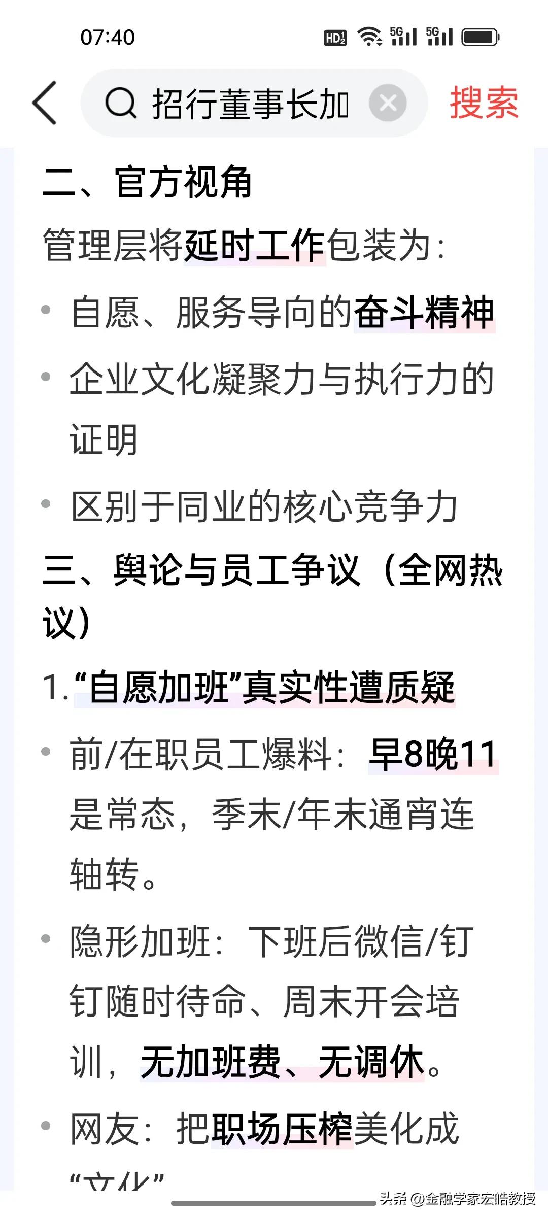 把“员工加班”当护城河?招行董事长把“员工很少准点下班”说成核心竞争力,体现员工敬业为客户提供优质服务。 他殊不知这是银行业的集体隐痛:不止招行,不少银行员工早8晚11是常态,季末年末通宵连轴转,隐形加班无加班费、无调休,早已是公开的秘密。 网点17点就关门,员工加班多在填报表、开会,根本不是服务客户。走得晚≠效率高,反而是流程冗余、管理低效的铁证——把本该8小时干完的活,硬生生拖成了“007”,还美其名曰“奋斗文化”。 深圳法院早已认定隐形加班需付薪,这种违反劳动法的“护城河”,只会透支员工信任,最终反噬企业口碑。真正的竞争力,从来不是熬出来的时长,而是工作制度的不断优化与升级,更是对劳动者的基本尊重。