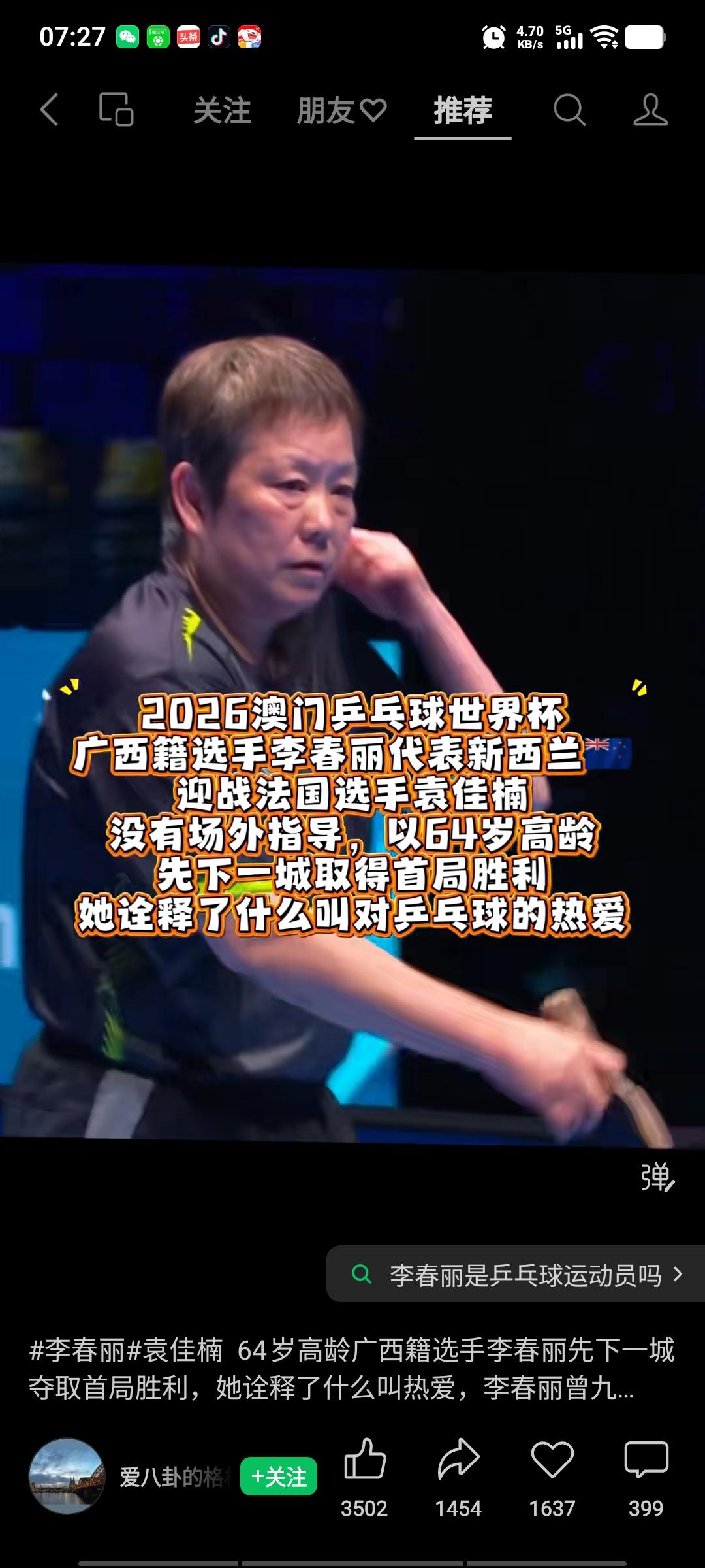 昨天,64岁的老国手李春丽代表新西兰出战澳门世界杯,创造了新的世界纪录。她比乒乓球界的长青树倪夏莲还年长一岁有余。李春丽生于1962年2月,是广西人,曾代表国乒参加世乒赛,1987年退役后前往新西兰。去年,她夺得大洋洲前三名,从而获得了参加世界杯的资格。 尽管昨天她以1比3不敌袁嘉楠,但她直板功底扎实,只是体力欠佳。赛后接受采访时,她表示自己非常热爱乒乓球运动,能与顶尖高手过招,感到十分开心。