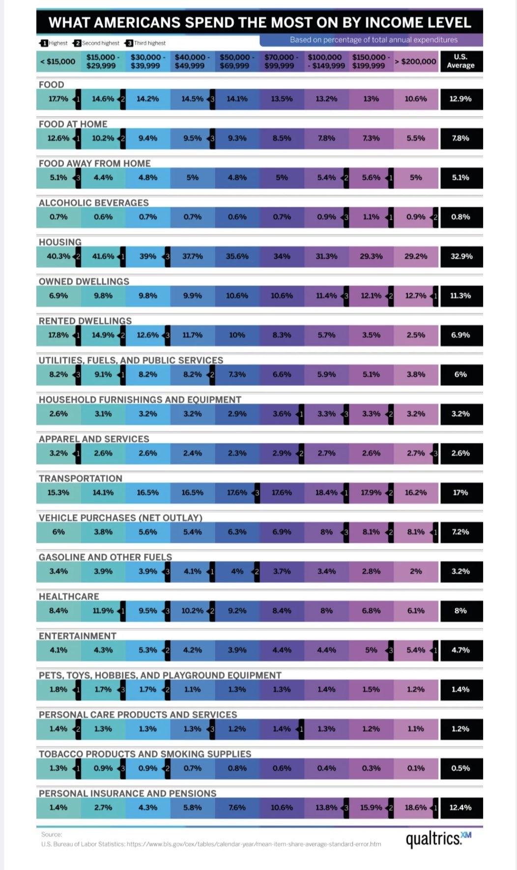 2025年中美两国居民支出占收入比例:食品:中国29%,美国13%; 居住:中国21%,美国33%; 医疗保健:中国9%,美国8%; 交通通信:中国15%,美国(只交通)17%; 衣着:中国5%,美国3%; 教育文化娱乐:中国12%,美国(只包括娱乐)5%。 (这个比例中国是按可支配收入,美国是按总支出,占可支配收入比例会更低) 中国在食品和教育文化娱乐方面支出均是美国的两倍。