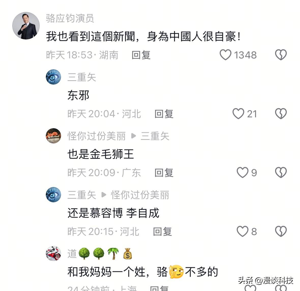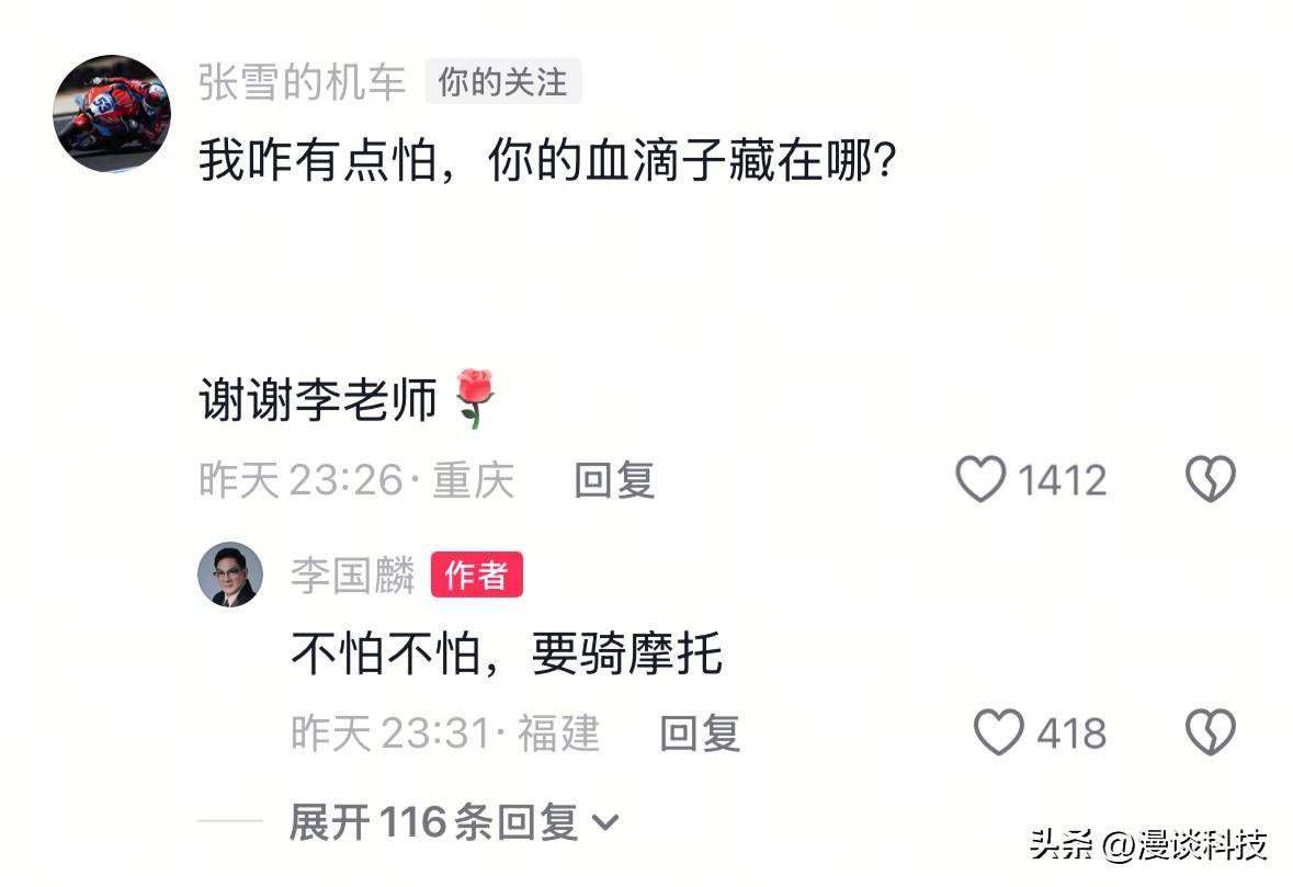 《天龙八部》中“鸠摩智”的扮演者李国麟在抖音发视频祝贺张雪机车夺冠,称其“让中国制造闪耀全世界”,“为你骄傲”,“为你自豪”。对此,没想到张雪竟然看到并留言回复到:“我咋有点怕,你的血滴子藏在哪?谢谢李老师。”李国麟则表示:“不怕不怕,要骑摩托。”二人有意思的互动引发网友留言热议,也算是梦幻联动了。 随后,在评论区同为香港演员的骆应钧留言:“我也看到这个新闻,身为中国人很自豪。”有意思的是,骆应钧曾经在《天龙八部》里饰演“慕容博”,更广为人知的角色是《射雕英雄传》里面的“东邪黄药师”。