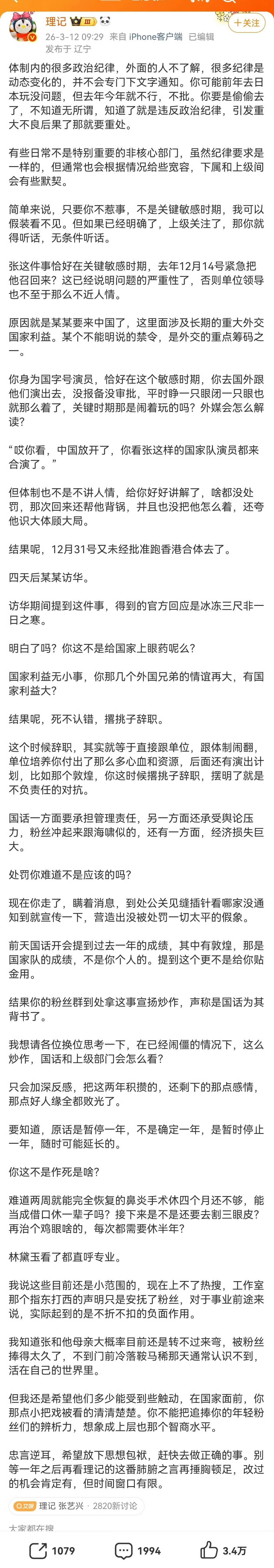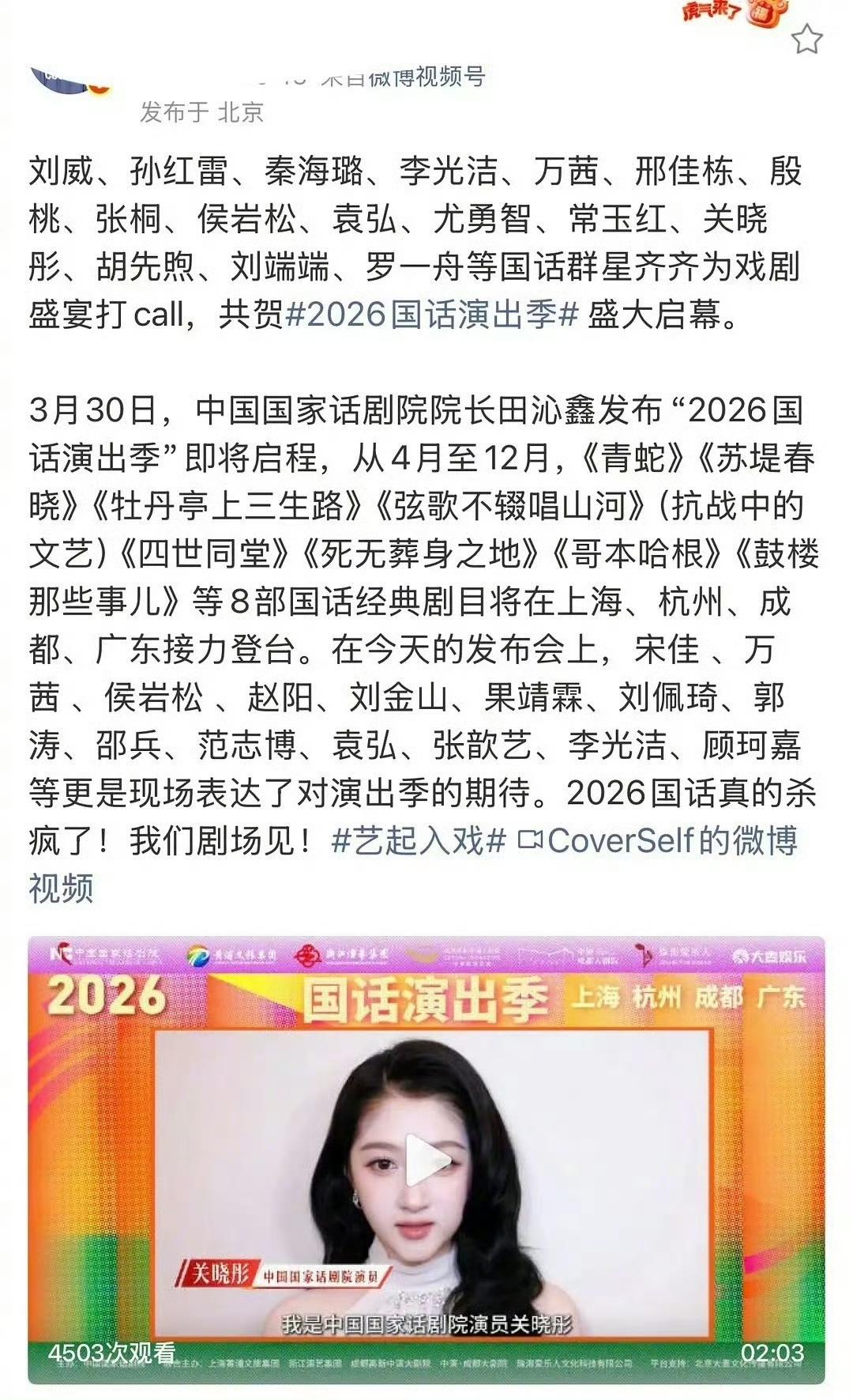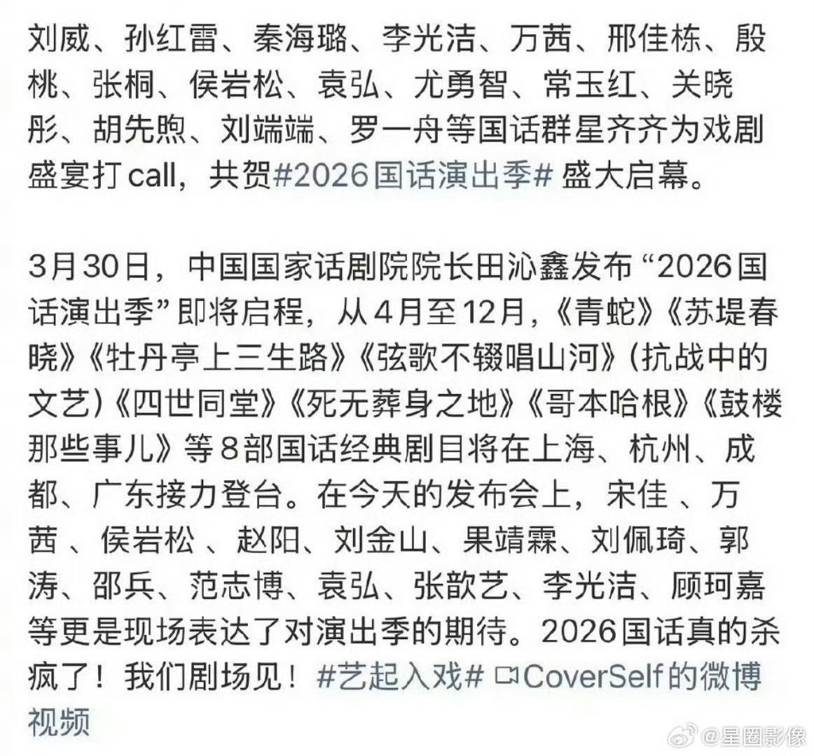 国家话剧院2026年演出季官宣,国话一众明星演员齐刷刷出来为单位打call,大名单里再没有了张艺兴的名字,看来理记说得没错,张艺兴这是可能真的和国家话剧院分道扬镳了。 如果事情确实是真的,真的很为张艺兴可惜了,凭他的才艺能力,再加上体制内的加持,本来是能往艺术家这条路上走的,但现在自己和妈妈这么不理智,这么没有政治铭感度,这条路却是越走越窄了,本来还觉得张艺兴是挺有格局和远大目光的艺人,没想到还能让事情的走向失控成这样,现在看来也不过尔尔。 不过,张艺兴真的是个极合格的艺人,业务能力强又敬业,对粉丝也好,重情重义的,就感觉性格有点倔,也希望他能平稳度过这次难关,早点出来活动和大家见面,继续他的演艺事业,还挺期待看到他的新作品的。