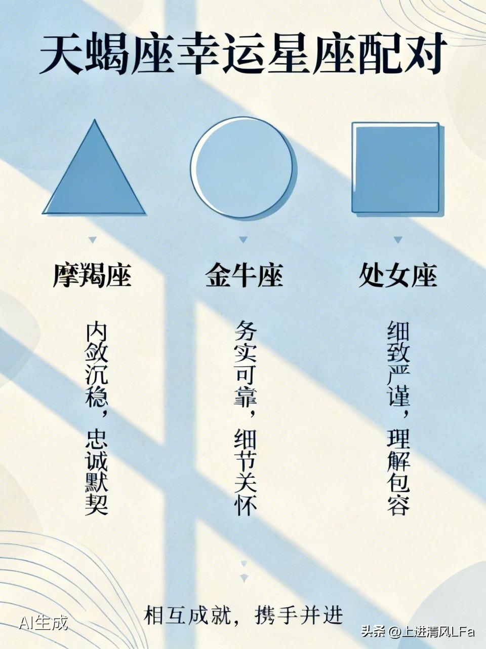 天蝎座遇到哪三个星座最幸运? 天蝎座遇到这三个星座超幸运! 首推摩羯座,都是内敛挂的,摩羯沉稳又低调,和天蝎相处距离感拿捏得刚刚好。他俩执拗又专一,能给彼此绝对的忠诚。摩羯还能敏锐察觉天蝎的脆弱,两人携手并进,互相懂对方。 然后是金牛座,务实的金牛能抚平天蝎的多疑,给足安全感。天蝎则能帮金牛跳出舒适区,金牛又让天蝎的生活更安稳,他们把在乎都藏在细节里。 最后是处女座,细致严谨的处女座理解包容天蝎,用理性帮天蝎梳理情绪。面对天蝎的疏离,处女座会耐心靠近,两人在磨合中相互成就,越处越默契。