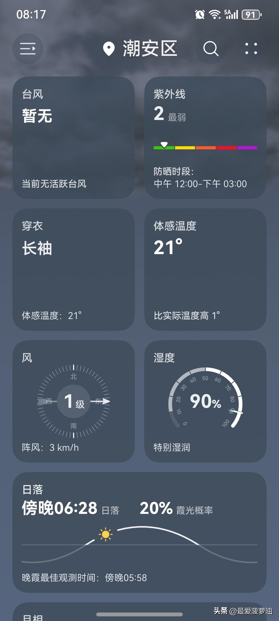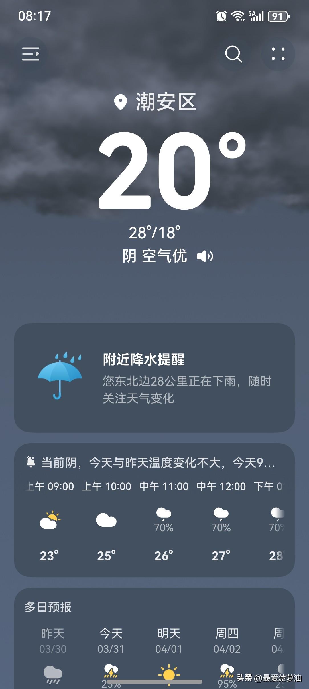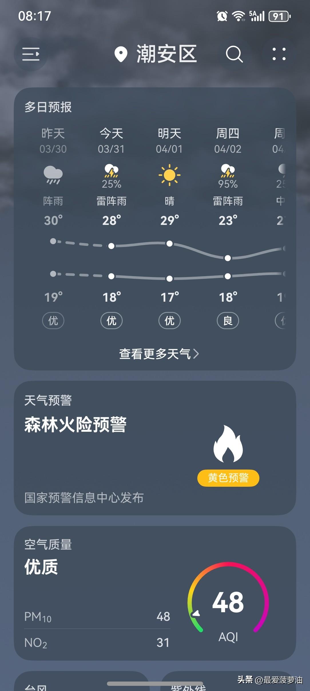 今天(31日),潮州有雷阵雨,气温18~28℃,此刻气温20℃,体感温度21℃。