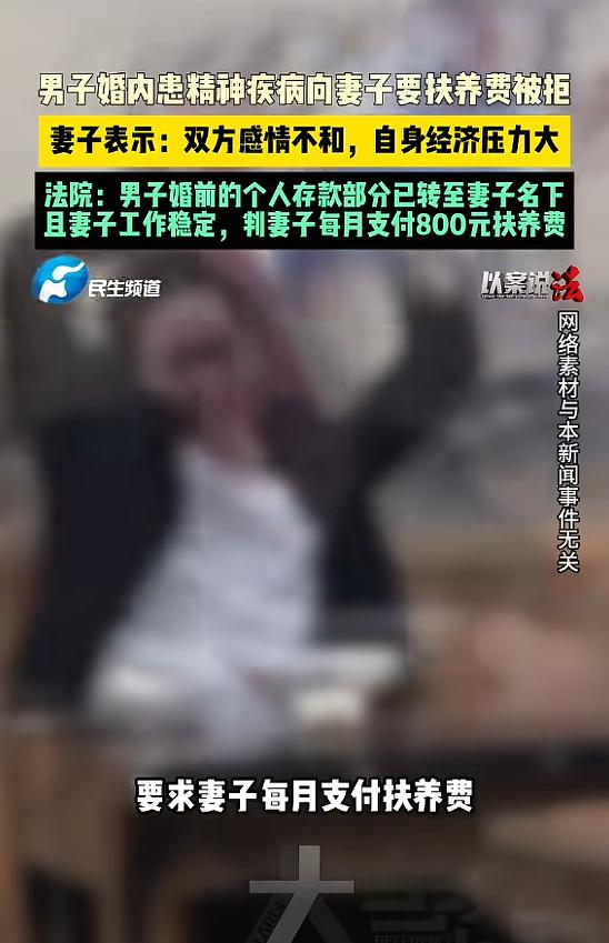 江苏泰州,一女子婚后感情不顺,与丈夫分居,后来丈夫被诊断患有精神疾病,因为他的父母、祖父母都去世,患病后他的生活陷入困境,所以要求女子支付抚养费,但妻子拒绝,于是丈夫将妻子告上法庭!法院:每月支付800扶养费! 张某和她的丈夫刘某,当初他们互相看对眼,满心都是彼此。 刚领完结婚证那阵儿,那黏糊劲儿就别提了,恨不得一天24小时都凑在一块儿,眼里心里全是对方。 可俩人结婚后一起过日子没撑多久,就慢慢有了矛盾、闹起了别扭。 刚开始的时候,也就是因为一些琐事,俩人就能拌上几句嘴。 到了后来,又为了家里的家务该谁做、做多少,争得谁也不肯让着谁。 渐渐地,俩人看彼此都觉得不顺心,别说吵架了,就连一句多余的话都懒得跟对方说,冷战成了俩人相处的常态。 最终,俩人是真的扛不住了,再也不想勉强凑活,干脆就分开住了。 分居之后,俩人彻底断了联系,你过你的小日子,我守我的小天地,彼此不掺和、不打扰。 但对于离婚这两个字,俩人从来没正经提过,就这么耗着。 与此同时,就在俩人分居了一阵子后,刘某突然发现自己的精神状态越来越差,晚上整夜整夜睡不着觉,白天精神恍惚。 而且情绪特别不稳定,有时候一点小事就能让他暴跳如雷,甚至还会出现一些奇怪的幻觉。 一开始他没当回事,觉得只是压力大,可到后来,他连正常上班都做不到,连自己的穿衣吃饭都快顾不过来了,没办法,只能去医院做全面检查。 检查结果出来的那一刻,刘某彻底傻了眼——医生诊断他患上了精神疾病,而且情况不算轻微,需要长期服用药物控制病情。 精神疾病患者不光需要长期吃药,还需要有人照顾日常起居,可刘某身边空无一人,直系亲属都已离开人世,所以患病之后,他的生活直接陷入了绝境。 当地相关部门得知刘某的情况后,经过多方走访调查,又征求了刘某本人的意愿,还有他老家村委会的意见,最终指定了刘某的叔父作为他的监护人。 而刘某的叔父,本身经济条件也一般,靠着自己的微薄收入,根本没法长期承担刘某的生活费和医药费,日子久了,也渐渐力不从心。 就在刘某的叔父一筹莫展的时候,猛地想起一件关键事儿——刘某和张某虽说分居好几年,可俩人从来没办过离婚手续。 所以两人依旧是合法夫妻,而张某作为刘某的妻子,按照规矩,本就有扶养刘某的法定义务。 想到这一点后,叔父跟刘某说了这个想法,俩人商量后,决定试着找张某说说。 随后,在叔父的陪同下,刘某找到了许久未曾联系的张某,向她提出了支付扶养费的请求。 可张某听完之后,想都没想就一口回绝了。 张某说,她和刘某早就分居了,这么多年来,俩人互不往来,感情早就没了,跟陌生人没什么区别,她凭什么要拿出自己辛辛苦苦挣的钱,去养一个跟自己没关系的人? 而且她自己也不容易,手里根本没有多余的钱,根本不可能补贴刘某。 被张某拒绝后,刘某和他的叔父实在没别的办法了,刘某将自己的妻子张某起诉到了当地法院,请求法院判决张某每月支付1500元的生活费。 法院最终判决,张某每月向刘某支付扶养费800元。 这件事情被发布到网络上后,网友们看完之后,议论纷纷。 有网友说:“虽说张某和刘某感情不好,分居多年,但两人并没有离婚,所以法律上还是夫妻,该尽的义务就不能少。” 还有网友表示:“做人不能太绝情,刘某无依无靠,又得了重病,张某作为妻子,就算感情破裂,也不该不管不顾。” 但也有网友表示:“两人早就分居,感情已经彻底破裂,俩人各过各的,张某没有义务再为一个形同陌生人的人付出,而且张某自己也有经济压力,凭什么要为一段名存实亡的婚姻买单。” 还有网友说到:“夫妻之间如果感情确实破裂,没法继续共同生活,还是及时办理离婚手续为好。” 对于这件事,你们怎么看? (信息来源:大参考《男子婚内患精神疾病向妻子要抚养费被拒,妻子表示:双方感情不和,自身经济压力大。法院:男子婚前的个人存款部分已转至妻子名下,且妻子工作稳定,判妻子每月支付800元抚养费。》)