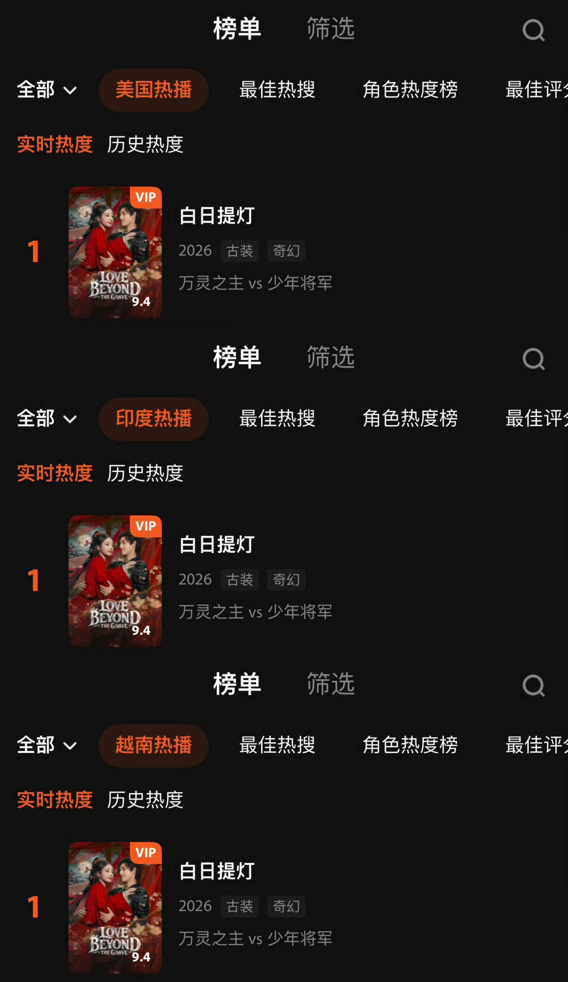 《白日提灯》截至目前已登WeTV新加坡、韩国、日本、越南、美国、印度站内热度榜第