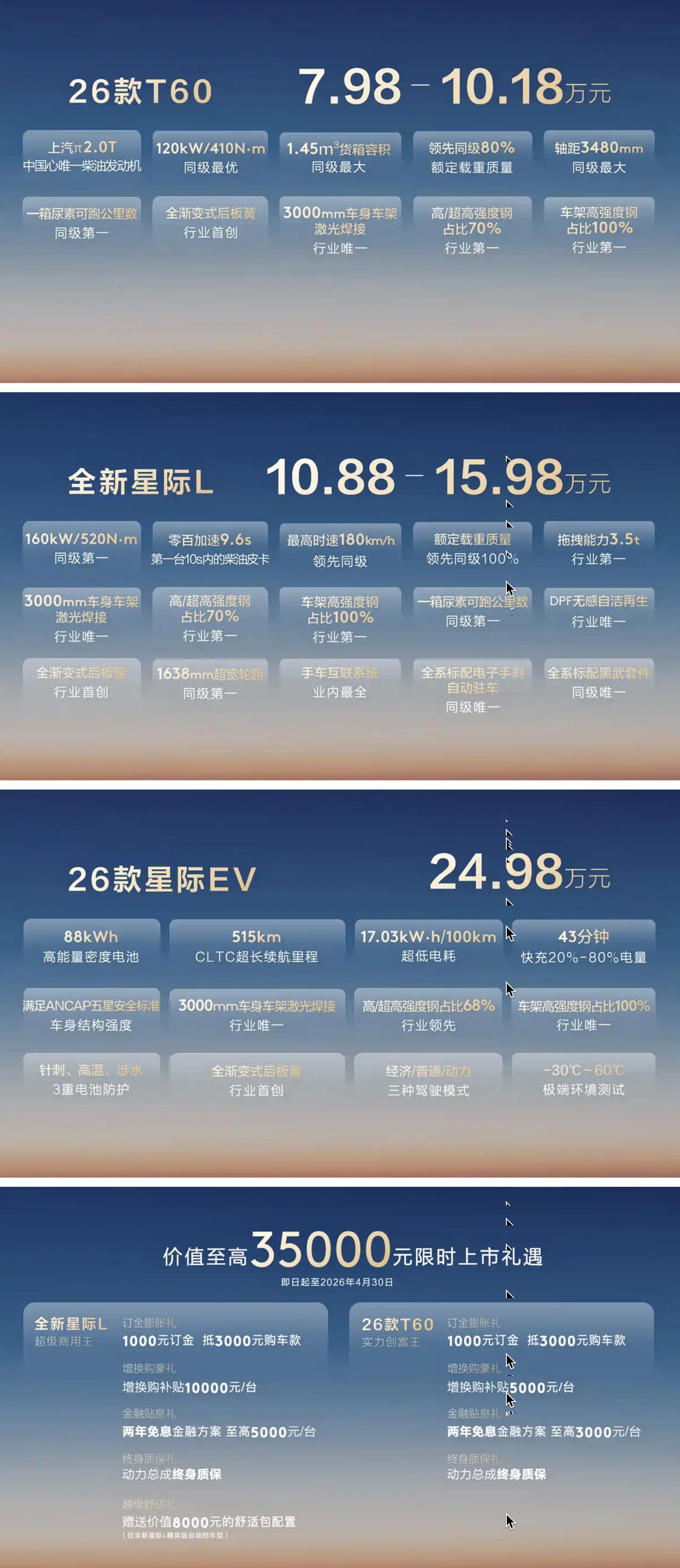 不知道昨天是什么好日子,一口气发布发布了5款车,谁的价格你觉得可以再砍砍? 大众ID.ERA 9X:32.98万起(预售) 坦克700 Hi4-T:51.8万(预售);坦克700 Hi4-Z:43.8万起(预售) 奇瑞QQ3 EV:5.89万起 银河星耀8远航家:12.98万起 大通星际L:10.88万起;星际EV:24.98万;T60:7.98万起