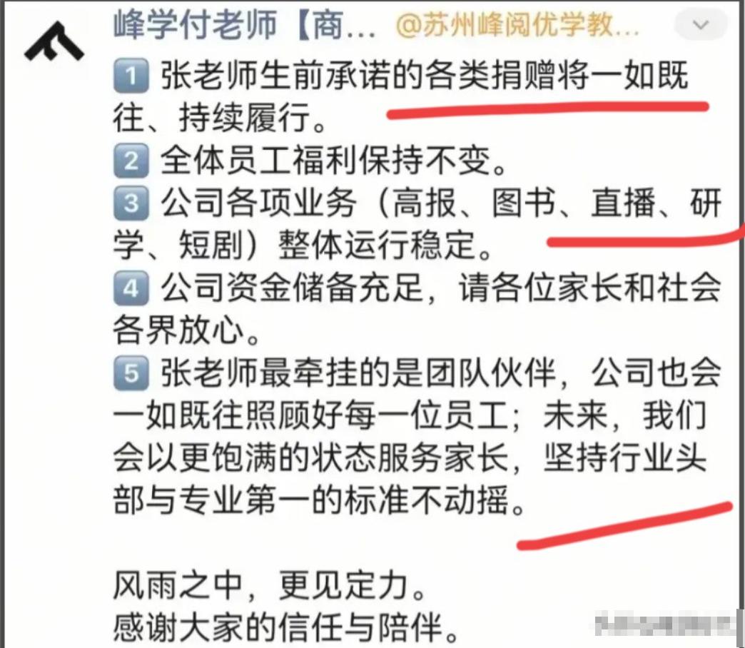 张雪峰去世头七这天,公司总经理武亮发了一篇长文悼念,里面不仅说了对公司未来的安排,还亲口透露了对张雪峰 11 岁女儿张姩菡的规划,更让人心里发酸的是,武亮在回复里说,已经把张雪峰生前常骑的那辆电瓶车仔细擦拭干净,好好保存起来了。 张雪峰,这位出身寒门、凭一己之力打拼成升学规划领域标杆人物的创业者,在公司跑步时突发不适,送医抢救后仍不幸离世。 他一生勤勉,从北漂考研讲师起步,凭借独特的风格走红,后来创立峰学蔚来,聚焦高考志愿填报和考研规划,影响了全国千万家庭,早已成为许多人心中的精神标杆。 他离世的消息传开后,全网陷入悲痛,后续他的追悼仪式顺利完成,却丝毫没有减轻人们心中的遗憾与哀伤。 张雪峰生前心里最放不下的,从来都是两样东西:一是他一手创办的峰学蔚来,二是11岁的女儿张姩菡。 他对女儿的疼爱,藏在每一个细微的规划里,不仅提前为女儿注册了近40枚“姩菡”商标,覆盖多个领域,还曾跟人说起,就算女儿学习不好,混个本科就行,将来进银行,他会把上亿存款存过去,让女儿一辈子衣食无忧。 网传他早在2025年3月就立好了遗嘱,指定张姩菡为唯一继承人,名下峰学蔚来75%的核心股权、十多家关联公司股份以及过亿存款,都由女儿继承,而且这份遗嘱订立在他再婚之前,现任妻子不在继承范围内。 不过这些细节目前还没有得到官方完全证实,外界也一直牵挂着这份遗嘱的真实性,以及张姩菡最终能得到怎样的保障。 随着张雪峰头七的到来,所有的牵挂和疑问,都在武亮的一篇长文中有了回应。 武亮作为张雪峰共事多年的伙伴,既是上下级,更是彼此信任的兄弟,他陪着张雪峰走过了最艰难的创业期,懂他的理想,也懂他的牵挂。 这篇长文没有华丽的辞藻,全是掏心窝子的话,字里行间满是对张雪峰的敬重与思念,也给所有关心张雪峰家人和公司的人,吃了一颗定心丸。 武亮在长文中明确了公司未来的安排,他承诺会继承张雪峰的遗志,带着团队继续把峰学蔚来做好,目前公司各项业务都在正常推进,线下咨询、线上课程没有丝毫停顿,员工的薪资福利按时发放,学员的志愿规划服务也没有受到任何影响。 他还特意说明,公司目前运营平稳、资金良好,后续会向外界公开经营状况,打消了外界对公司能否撑下去的疑虑。 除了公司的安排,武亮更重点透露了对张姩菡的规划。 他承诺,会完整保留张雪峰的所有个人账号和作品,这些都是张雪峰留给女儿最珍贵的念想,是他一辈子的心血,谁也不会动,会一直等到张姩菡长大成人,亲手交到她的手里。 更让人动容的是,武亮明确表示,等张姩菡长大,会把峰学蔚来完整地交托给她接手,这不是他个人的承诺,而是整个团队对张雪峰的承诺,是对这份事业的坚守,更是对这个年幼女孩的守护。 在武亮发文之后,有网友留言说起张雪峰生前常骑的那辆电瓶车,3月29日深夜,就有网友在公司楼下看到这辆车停在路边,担心被雨淋到,留言建议挪到公司内。 武亮看到后及时回复,说已经把这辆电瓶车仔细擦拭干净,好好保存起来了。 他坦言,擦拭电瓶车的时候,自己忍不住泪流满面,眼前总会浮现出张雪峰慈爱的目光。 这辆电瓶车,见证了张雪峰从普通讲师到创业老板的艰辛历程,或许是他奔波于各个讲座之间的代步工具,或许是他下班后放松心情的陪伴,也或许是他偶尔接女儿放学时的座驾,如今被妥善保存,成了最动人的念想。 张雪峰的离世,不仅让家人悲痛,也让外界充满了担忧。 大家担心11岁的张姩菡难以承受失去父亲的打击,更担心她年纪太小,无法打理父亲留下的巨额财产和复杂股权,怕有人会打这些财产的主意。 还有不少网友担心,张雪峰是峰学蔚来的灵魂人物,他的个人IP影响深远,公司能否实现从个人IP到团队体系的过渡,能否平稳走到张姩菡长大接手的那一天,还是个未知数。 不过武亮的一系列举动,慢慢打消了这些担忧。 他不仅承诺护着张姩菡平安长大,还计划未来为张雪峰出版传记、继续开展直播,让大家感受到张雪峰并未走远。 与此同时,社会各界对张雪峰的缅怀也从未停止,头七当天,有网友原本计划到殡仪馆门口为他点灯,因为保安阻止,便改去灵岩山供灯,用这样朴素的方式,表达对他的思念。 武亮曾说,他永远爱戴张雪峰,评价张雪峰以德服人、以才服人、以言服人,守护张雪峰的事业、回忆和未完成的梦想,是整个团队共同的心愿。 这份担当,这份重情重义,让人敬佩。 张雪峰虽然走了,但他的事业有人守,他的女儿有人护,他留下的痕迹有人铭记,这便是对他最好的告慰。 如果各位看官老爷们已经选择阅读了此文,麻烦您点一下关注,既方便您进行讨论和分享,又能给带来不一样的参与感,感谢各位看官老爷们的支持!