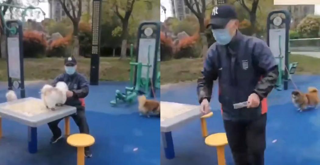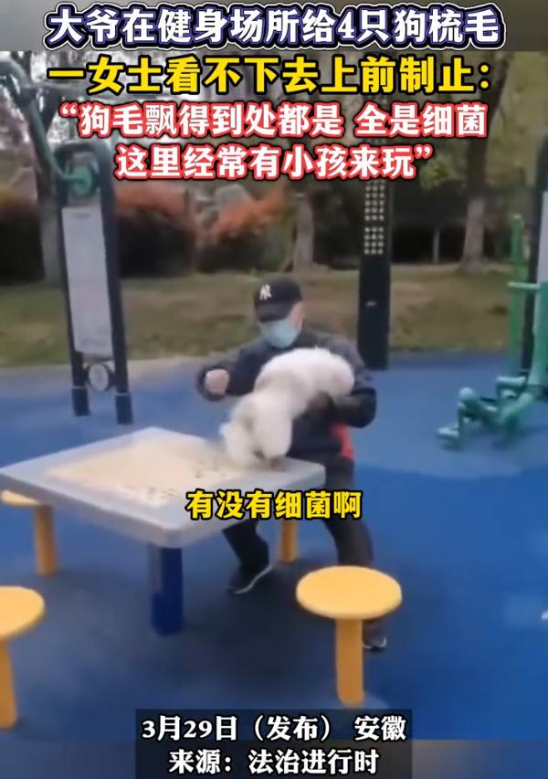 这是正义大妈!安徽,一位大妈去公园溜达,看到一位大爷在健身场所给狗梳毛,女子越看