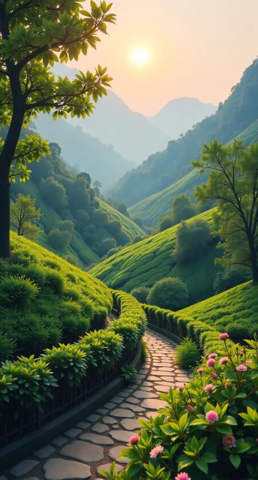 清晨微露采茶忙,翠叶轻摇映日光。 山风拂面香满径,笑语盈盈入翠廊。西湖龙井