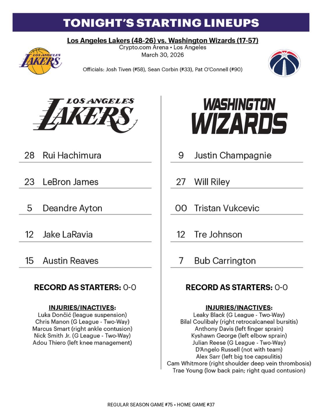 奇才首发:卡林顿、约翰逊、尚帕尼、莱利、武克切维奇湖人首发:里夫斯、拉拉维亚、八村塁、詹姆斯、艾顿