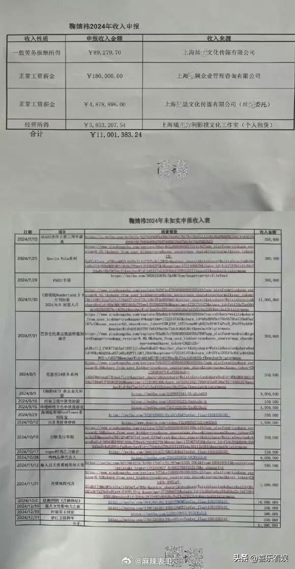 举报信里写得很具体,说鞠婧祎2024年申报收入才1100多万,可实际收入超了5000万,瞒报的比例直接超过85%,这差距也太离谱了。