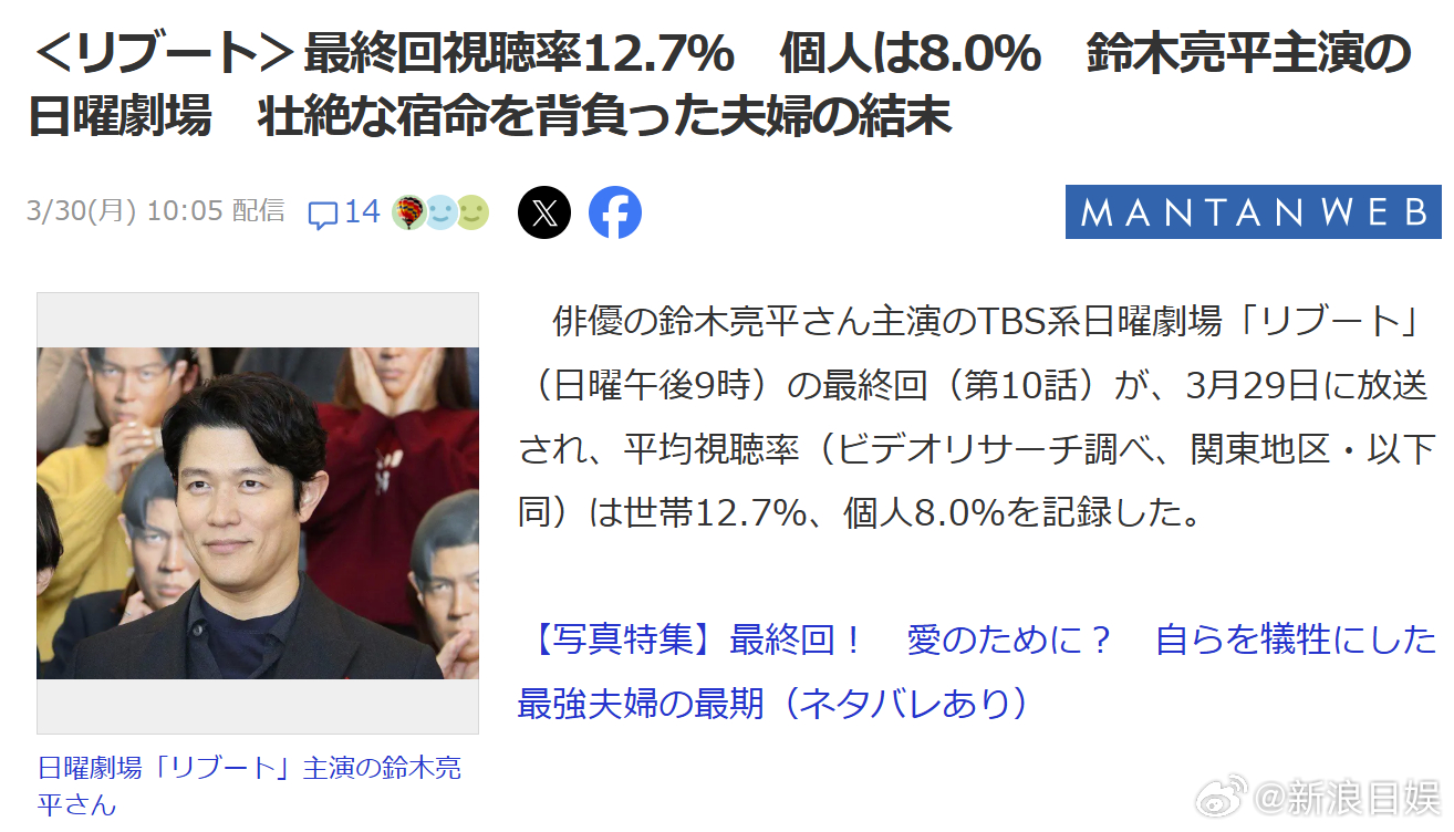 海外影视速递铃木亮平主演、户田惠梨香共演的2026年1月期TBS电视台日曜剧场《Reboot》最终话北村匠海特别出演,世代收视率12.7,个人收视率8.0。该剧讲述了被诬陷杀害妻子的平凡西点师,为了证明自身清白,诱导负责案件调查的刑警,从而踏上追寻真相之旅的悬疑故事。经营早濑洋菓子店的西点师早濑陆(铃木亮平饰),一面鼓励健壮成长的儿子积极向上,一面照料身体欠佳的母亲,以开朗姿态鼓舞着全家。然而两年半前失踪的妻子夏海被发现身亡,陆却因不明证据遭逮捕。负责案件侦办的搜查负责人仪堂步实为与黑社会勾结的腐败刑警。为亲手找出真凶,陆决意取代仪堂的外貌展开行动。铃木亮平将挑战一人分饰两角——早濑陆与仪堂步。