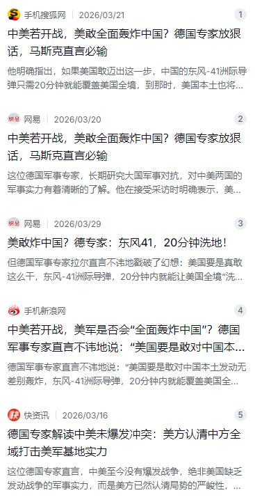 中美若开战,美军是否会“全面轰炸中国”?德国军事专家直言不讳地说:“美国要是敢对中国本土发动无差别轰炸,东风-41洲际导弹,20分钟内就能覆盖美国全境。”对此,马斯克也表示:美国永远也无法打败中国,这连小学生都知道。中国科技早已经崛起,不要轻视了中国! 麻烦看官老爷们右上角点击一下“关注”,既方便您进行讨论和分享,又能给您带来不一样的参与感,感谢您的支持! 事情的起因,要从德国一位资深军事专家的分析说起。他在接受媒体采访时,聊到了中美军事博弈的话题,针对“美国会不会像对付伊拉克那样,对中国本土发动地毯式轰炸”这个问题,他给出了一个相当斩钉截铁的回答。这位专家认为,美国过去之所以敢在一些国家搞无差别轰炸,根本原因是那些国家没有足够的反制能力,打完了对方也只能忍着。但中国的底牌完全不一样。他直接点明,美国要是真敢对中国本土发动全面轰炸,中国军队的东风-41洲际导弹,二十分钟之内就能覆盖美国全境。这个说法听着有点狠,但在大国博弈的语境里,其实是一种非常冷静的威慑逻辑——你打我,我也能立刻打回去,而且速度和力度都不会比你差。 几乎是在同一个时间段,埃隆·马斯克也在一场公开对话中被问到了类似的问题。有美军退役上将追问他,美国能不能在战争中打败中国,马斯克毫不含糊地回答:“美国永远也无法打败中国,这连小学生都知道。”他还强调,中国的科技实力早就已经崛起,如果美国继续轻视这一点,后果会很严重。马斯克这番表态之所以引发这么大的反响,不只是因为他是一个科技公司的老板,更因为他在全球供应链和高端制造业领域有着切身的体会。特斯拉上海超级工厂从动工到投产只用了十个月,这个速度放在美国,光是走完环评流程可能就要三年。他亲眼看着中国工人的效率、工程师的拼劲、整个产业链的响应速度,这些东西在他眼里就是硬实力,不是靠嘴说出来的。 德国专家和马斯克的判断,说到底都建立在一个共同的现实基础上:东风-41洲际导弹的存在,从根本上改变了中美之间的攻防格局。这款导弹是中国自主研制的第四代战略核导弹,早在1984年就正式立项,到2019年国庆阅兵正式公开亮相,整整花了三十五年时间打磨。它的最大射程超过一万四千公里,不管从中国哪个地方发射,都能覆盖美国本土全境,最高速度可以达到二十五马赫,接近甚至超过了这个速度。从飞行速度来看,导弹飞越太平洋打到美国西海岸大概十五到二十分钟,打到东海岸也不会超过半小时。这个速度意味着什么?意味着从雷达捕捉到信号到弹头落地,留给反导系统的反应时间可能还不到一分钟。美国现有的反导体系,包括萨德、宙斯盾、爱国者,都是针对弹道相对固定的目标设计的,而东风-41采用了独特的“钱学森弹道”技术,导弹在重返大气层时可以像打水漂一样进行滑翔变轨,轨迹完全不规则,现有的拦截手段几乎无法有效锁定和预测。 更让对手头疼的是它的分导式多弹头技术。一枚东风-41可以携带六到十枚独立的核弹头,每个弹头都可以锁定不同的目标,发射之后就像天女散花一样分散打击。美国本土总共只有七套萨德反导系统,其中大部分还部署在海外,本土真正能用的只有两三套,每套满配也就四十八枚拦截弹。如果中国一次性发射二十四枚东风-41,就相当于两百四十个核弹头同时砸向美国本土,就算拦截弹百分之百命中,也根本挡不住这种饱和攻击。说白了,这不是技术问题,是数学问题。 当然,很多人可能会问:中国不是承诺了不首先使用核武器吗?那美国如果只打常规战争,不动核武器,中国会不会被动挨打?这个问题问到点子上了。关键就在于“全面轰炸中国本土”这个动作本身的性质。一旦美国对中国本土发动无差别轰炸,摧毁基础设施、杀伤平民,那就已经不是常规战争了,而是直接踩穿了核门槛。中国的核政策虽然是不首先使用,但在国家生存受到根本性威胁的情况下,这个承诺就不适用了。美国决策层心里很清楚这一点——自己的航空母舰再厉害、轰炸机再先进,能拿纽约、洛杉矶被核弹平推的后果来赌吗?这就是为什么冷战时期美苏两个超级大国之间摩擦不断,但从来没有人敢把战火烧到对方本土。因为大家都清楚,一旦开了这个口子,就没有回头路可走。 说完了军事层面的硬实力,再来看经济层面的现实。中美两国的经济深度捆绑,不是一个“脱钩”就能轻易扯断的。两国之间的年贸易额高达数千亿美元,美国的农场主、硅谷的工程师、华尔街的基金操盘手,多少人的饭碗都跟中国这条供应链绑在一起。就拿手机来说,芯片断了、零件缺了、物流停了,美国消费者的生活成本会立刻暴涨。全球产业链不是一天建成的,真要打起来,产业链崩了,谁都没法独善其身。