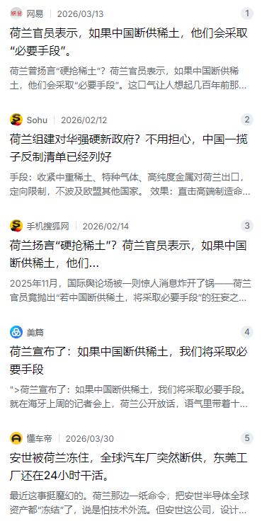 荷兰扬言“硬抢稀土”?荷兰官员表示,如果中国断供稀土,他们会采取“必要手段”。这口气让人想起几百年前那个,靠航海抢劫起家的荷兰。这话听着唬人,仔细一扒全是漏洞。 麻烦看官老爷们右上角点击一下“关注”,既方便您进行讨论和分享,又能给您带来不一样的参与感,感谢您的支持! 荷兰官员以所谓“国家安全”为由,公开扬言如果中国断供稀土,他们将采取“必要手段”。这话乍一听挺唬人,不知道的还以为荷兰手里攥着什么能反制中国的杀手锏。但实际上,这话刚说出口,就在网上被不少人当作笑谈。 好多网友第一反应就是,这味儿怎么这么熟悉?像极了几百年前那个靠海盗行径起家的老牌殖民帝国。逻辑简直如出一辙:我看上的就是我的,我得不到的就去抢。这种骨子里的做派,到现在也没怎么变。按他们想的那样,好像是准备“硬抢”了?这年头还能有这操作,确实是令人大开眼界。 但问题是,这是几百年前大航海时代的剧本,拿到2025年这高度全球化的现代,注定水土不服。这帮荷兰官员是不是在自己办公室开会开得太多,被垄断的优越感冲昏了头脑?实在不行,建议他们赶紧去查查自家ASML公司的账本,看看EUV光刻机生产线上的高精度磁铁是哪来的,再来说狠话。 稍微看看数据就明白了,荷兰说要“采取必要手段”,手里有啥牌?欧洲那点家底儿怕是兜不住。真论起来,能用来反制中国的牌近乎为零。众所周知,现代半导体制造业极度依赖稀土,尤其是光刻机这类精密设备。咱们一位不愿意透露姓名的供应链人士算过一笔账,荷兰从中国进口的稀土量,占到咱们总出口量的四分之一还多。 尤其是ASML那台EUV光刻机,里面那些高精度磁体和激光发生装置,一刻都离不开镝、铽、钕这些高纯度中重稀土。每造一台这种天价机器,至少得消耗10公斤以上的高端稀土磁材。关键是,这玩意儿全球只有中国能稳定量产。就算荷兰人把仓库塞得满满当当,撑死了也就够几个月的消耗。一旦这条线断了,整个ASML都得跟着歇菜。所以,放狠话谁都会,真要是哪一天中国的出口管制文件一下来,最先坐不住的就是这帮人自己。 有意思的是,这已经不是双方第一次在稀土问题上掰手腕了。早在2025年10月,咱们商务部就发过几份公告,把稀土和相关设备的出口管制范围扩了扩,要求那些出口含有咱们稀土资源产品的境外企业,都得先回来审批。那段时间,荷兰政府因为没收中企资产的事,跟咱们闹得挺僵,这个稀土管控措施的出台,某种程度上也是对这种恶意行为的有力回应。结果大家也看到了,ASML的CFO当时就急得在投资者会议上抱怨说这会影响交货速度,让那些芯片巨头排着队干等。再后来,应欧盟那边沟通的要求,咱们也暂停了一部分出口管制措施,算是给双方继续谈判留了个台阶。但台阶是台阶,主动权到底在谁手里,长眼睛的人都看得清。 仔细想想,荷兰这个国家能在国际上拥有如此之高的产业地位,很大程度上就是靠ASML这台光刻机硬撑起来的。一旦ASML的供应链因为稀土被卡脖子,那对整个欧洲的半导体产业、汽车制造业,乃至高端装备工业都是毁灭性的打击。去年10月中国出台稀土出口管制新规那会儿,就已经把范围扩大到了中重稀土、永磁体、特种气体和高纯度金属这些核心领域,而且专门针对荷兰进行定向限制,还不波及欧盟其他国家。这一下子就打在了七寸上。本来想用技术封锁压制中国的半导体发展,结果反而让自己的高端制造业命门暴露无遗。产业链条长着呢,你断我的光刻机,我就断你的稀土供应,看谁先疼。 其实在技术层面,我国在稀土加工领域的优势是其他国家短期内难以逾越的。早在1975年,徐光宪院士就提出了具有划时代意义的串级萃取理论,把稀土的分离纯度从国际平均的90%到95%一下子提升到了99.99%。这项技术的诞生彻底改变了世界稀土格局,使我国稀土分离技术和产业化水平跃居世界首位。经过几十年的发展和迭代,如今中国的稀土分离纯度已经稳定达到99.999%以上。反观国外,像美国唯一规模化稀土生产商MP Materials,搞了好几年,产品纯度还停留在99.9%的水平,差着一个数量级。 现代高端制造业需要的可不是粗加工的矿石,而是纯度极高的稀土氧化物和金属,没有这套技术体系,就算挖出再多的矿石也没用。所以,荷兰官员那种老掉牙的强硬表态,完全是低估了中国稀土工业的技术壁垒和产业链韧性。这种单边对抗的思维,说白了就是一种极其短视的行为。荷兰要是真心想保住ASML和欧洲那点珍贵的高端制造业,唯一的出路就是坐下来,心平气和地跟中国谈谈合作。毕竟,现在这个世界,早就不是谁拳头大谁说了算的年代了,得讲理,也得讲互利共赢。