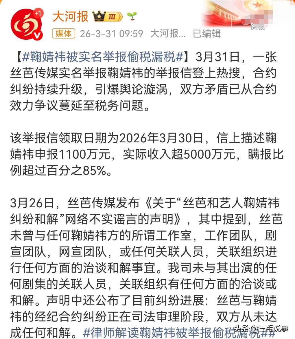 不管是不是真的,有疑问就必须要查起来,也已经要查了。 3月31日热搜,鞠婧祎被实名举报偷税漏税。 毕竟是名人,这可是热搜啊,热搜值得用心对待。 她被举报有这样的问题,那必须查起来呀。 要是真的发生这样的事情,那也算是大功一件,就要就要让这样的人付出代价。 这可是实名举报,要引起重视,如果证明是诬告的话,那举报者那也是有责任的。