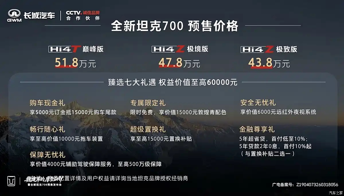 新款坦克700 Hi4-T/Hi4-Z开启预售,43.8万元起。