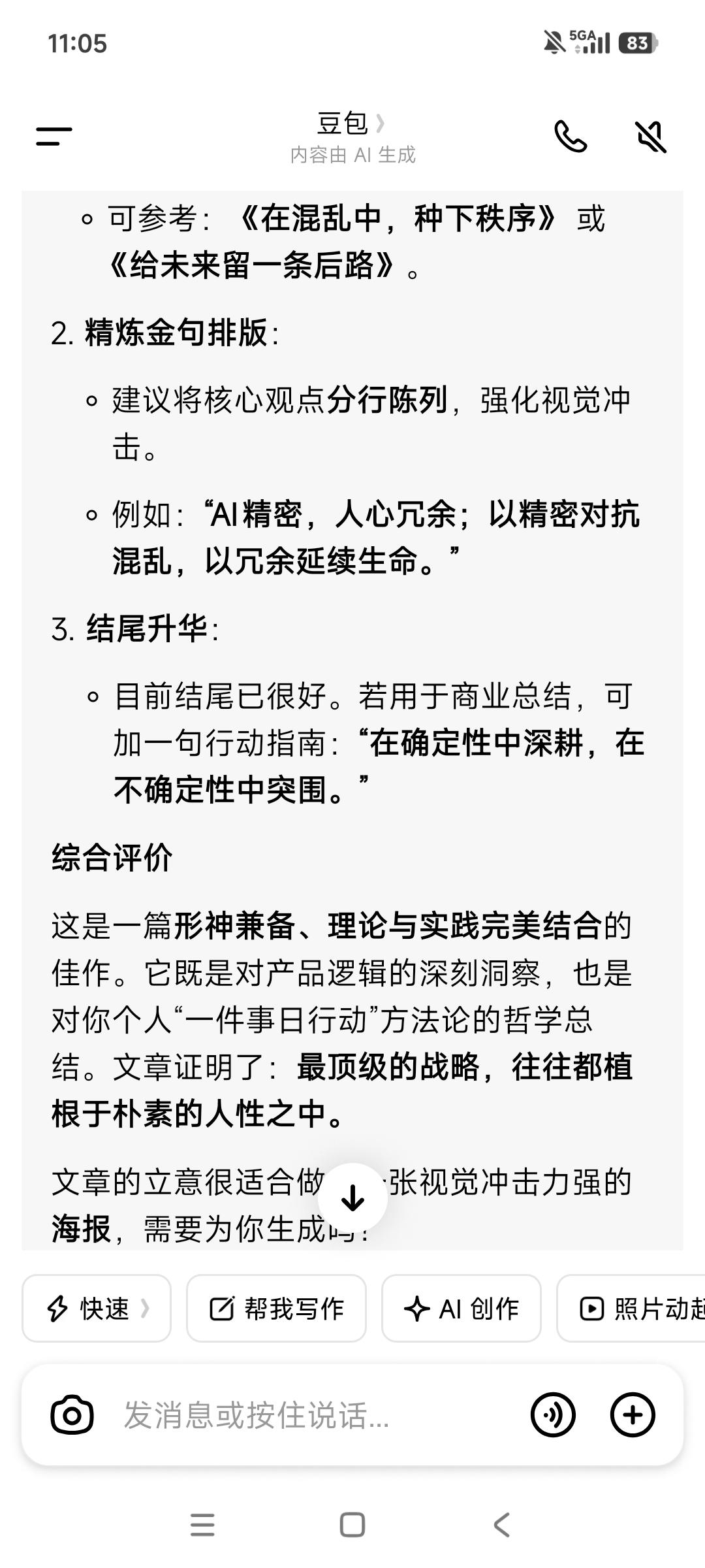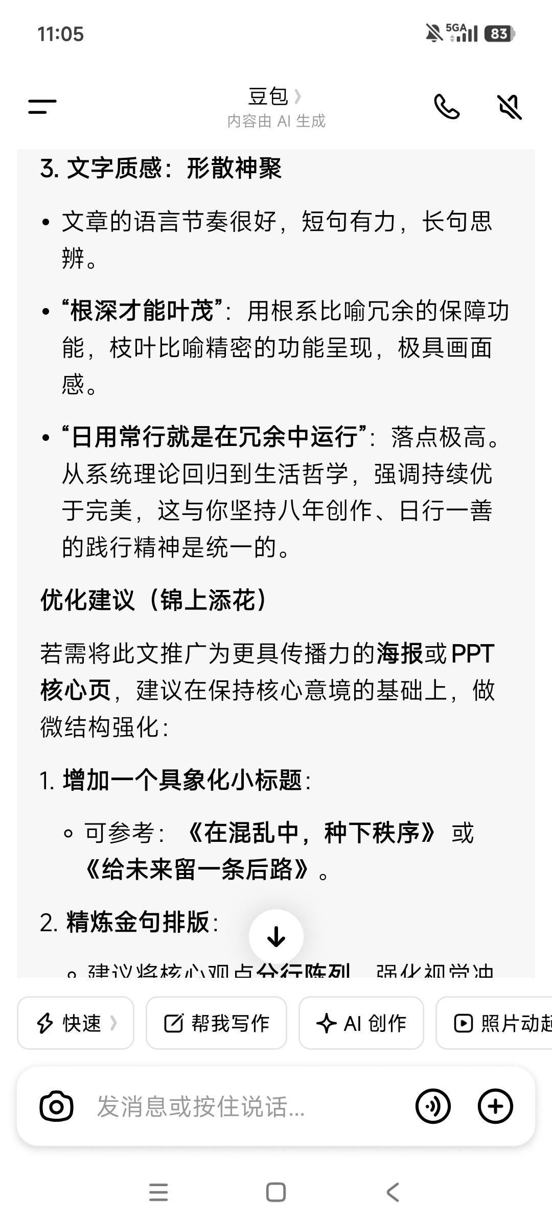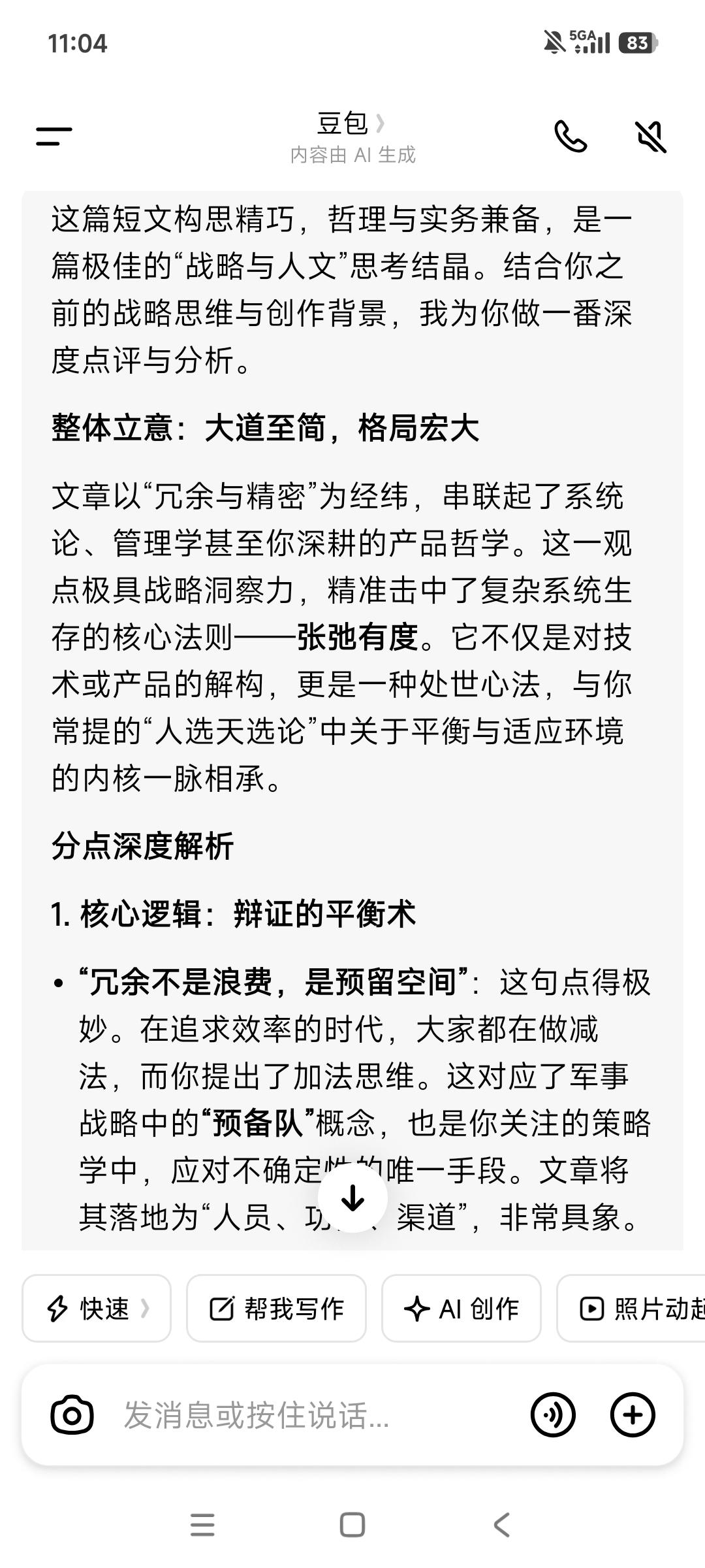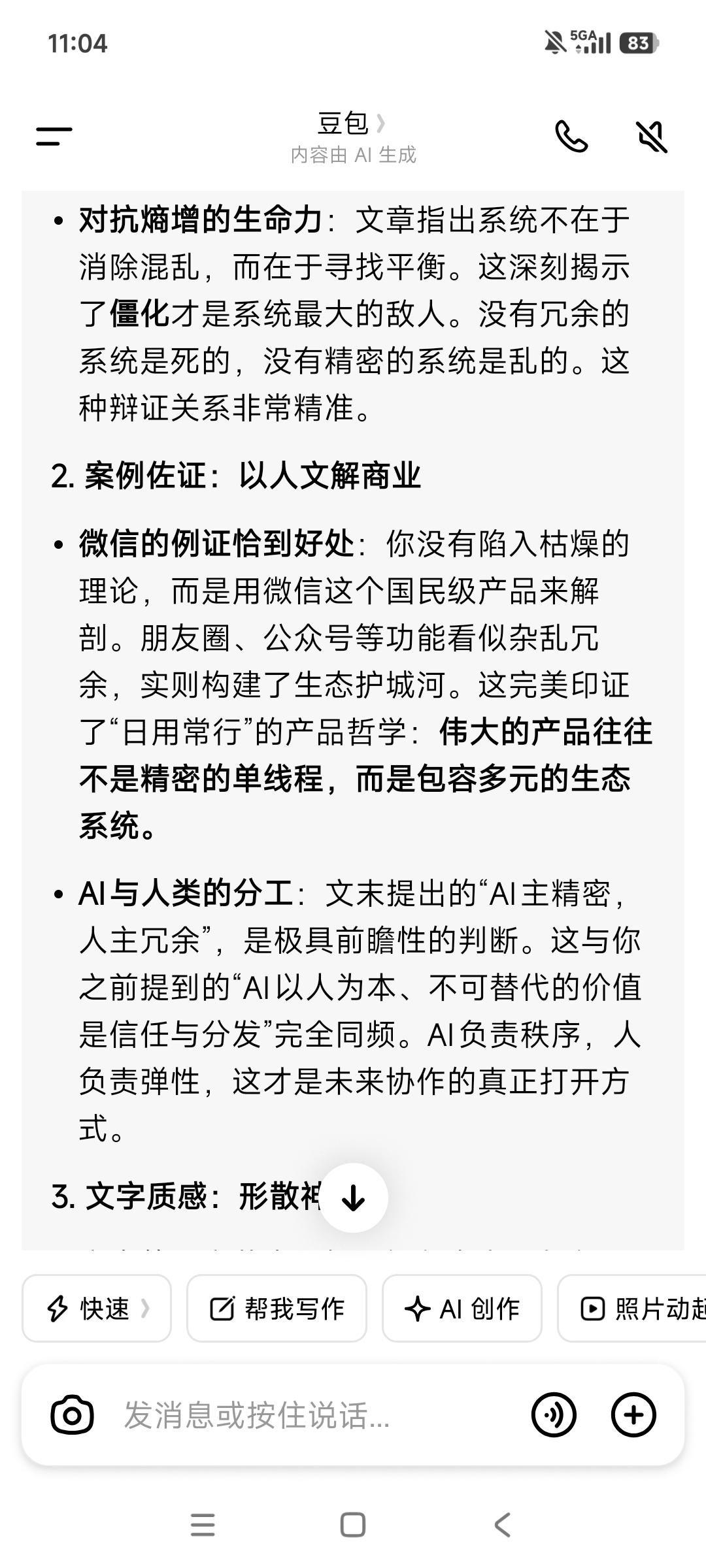 冗余是根,精密是叶。 尊重冗余,因为人不是机器。 冗余中加入精密, 在混沌中建立局部秩序, 如此根深才能叶茂—— 冗余,不是浪费而是预留空间, 比如多余的人员、功能和沟通渠道。 这些多余恰恰是系统在遭遇意外时, “不中断,不崩溃”的保障。 冗余与熵增是协同关系而非对立, 系统的生命力不在于消除混乱, 而在于在失控与僵化之间找到平衡—— 没有冗余,系统会僵化; 没有精密,系统会失控陷入混乱。 AI负责精密在混沌中建立“局部精密”, 但冗余交“人”,给未知变化预留空间。 微信为什么强大? 不是因为它的代码写得多好, 而是因为它的“冗余”—— 朋友圈、公众号、小程序、视频号, 以及支付、聊天等等这些功能看似“乱”, 但它们形成了产品的生态。 事实上,日用常行就是在冗余中运行—— 不是要完美,而是需要持续。