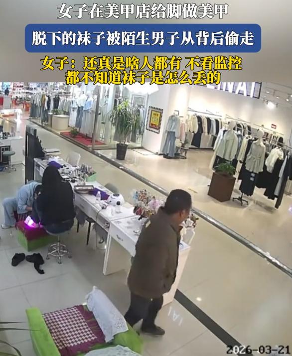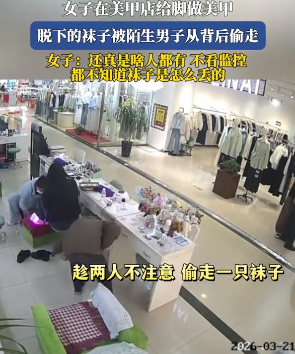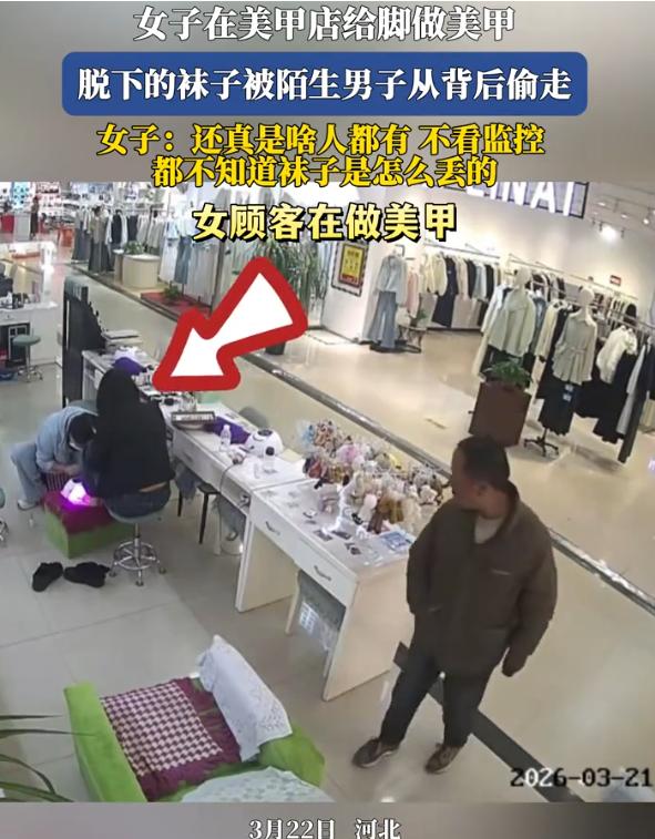 太奇葩了!河北,女子去商场里给脚做美甲,不料,做完后却发现放在鞋里的一只袜子不见了,查看监控后,发现竟然被一名陌生男子从背后偷走,期间更是做了个让人诧异的举动。女子:不看监控都不知道怎么丢的。 一位女子趁着没事,想着天气逐渐暖和了,快要到了穿凉鞋的时候,就想着给脚部做个美甲,显得精致又好看。 于是她特意选了一家商场里口碑还不错的美甲店,进门之后挑了半天,选了一款既显白又不浮夸的款式。 随后就坐在美甲椅上,安安静静待着等待美甲师开工。 负责给她做美甲的小姐姐,手艺确实没话说,动作利落又细致。 拿出工具、修剪指甲、去除死皮、打磨甲面,再一步步上色、封层,每一个步骤都做得有条不紊,看着就特别专业。 而这位女子,全程所有的注意力,都集中在了自己的脚上,眼睛一眨不眨地盯着美甲师的动作,就怕做出来的效果和自己预期的不一样。 至于身边过往的行人,还有自己脱下来放在椅子旁边的鞋子,她是真的没放在心上,从头到尾都没主动看一眼。 由于做美甲本身就比较耗时,前前后后差不多耗了很长时间。 就在她全身心放松、毫无防备的时候,一个陌生男人没有留意她身上的其他东西,偏偏就把目光,锁定在了她放在鞋里面的一只袜子上。 她和美甲师,因为全程都专注于美甲,对身边这个男人的举动,没有丝毫察觉。 一段时间后,美甲师终于停下了手,笑着对她说“做好啦,你看看满意不”。 这位女子看着指甲做的很好看后,就准备穿上袜子和鞋起身。 可就在她的手伸进鞋里的那一刻,整个人都愣住了——一只鞋里的袜子安安静静地躺在里面,另一只鞋里的袜子,竟然不翼而飞了。 她赶紧在自己的座位周围仔细地找了起来,可地上干净得一尘不染,别说袜子了,就连一根头发丝都找不到。 更奇怪的是,她的鞋子一直安安稳稳地放在原地,没有被人挪动过的痕迹,其他贵重物品,也都完好无损,一样都没少。 唯独一只不值钱的袜子,不见了踪影。 当时她还在心里琢磨,大概率是自己不小心弄丢了,或者是保洁阿姨打扫卫生的时候,误把袜子当成垃圾收走了,压根没往“被偷”这个方向想。 可当工作人员把监控画面调出来,播放给她看的时候,她浑身都起了一层鸡皮疙瘩。 监控画面拍得十分清晰,画面中,一个陌生男子目光直直地盯着她放在椅子旁边的鞋子,就那么一动不动地看了两秒钟。 随后,这个男人飞快地左右扫了一圈,确认女子正全神贯注盯着自己的脚,美甲师也在专心制作,两人都完全没留意到他这边的动静后,便蹑手蹑脚地绕到了女子的身后。 他的动作轻得几乎没发出半点声响,缓缓弯下腰,伸出手,指尖小心翼翼地探进她的鞋里,随后轻轻一抽,就把那只袜子从鞋里取了出来。 抽完袜子之后,他快速直起身,把袜子紧紧攥在手里,装作什么都没发生的样子,慢悠悠地走出了美甲店。 后来,她把这件事情发到了网上,吐槽自己的奇葩经历,网友们看到之后,纷纷留言。 有网友说:“自己逛超市的时候,把一包纸巾放在购物车旁边,低头挑了个水果的功夫,纸巾就没了。” 有网友说道:“看他的动作那么熟练,明显就是早有预谋,说不定不是第一次做这种事了,想想都觉得可怕,以后出门真的要多留心。” 还有网友吐槽:“偷钱偷手机的见多了,偷袜子的还是头一回见,他到底图啥啊?”