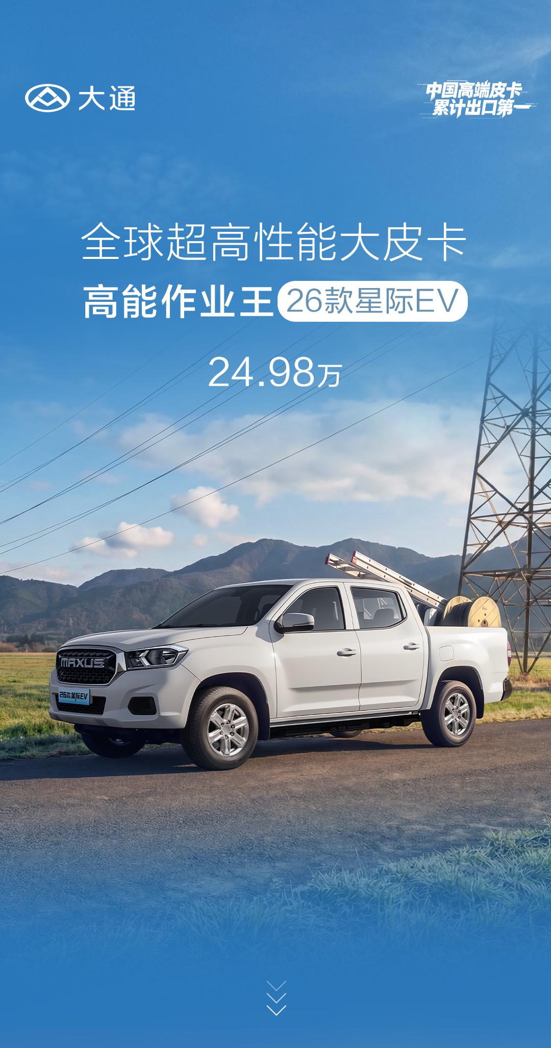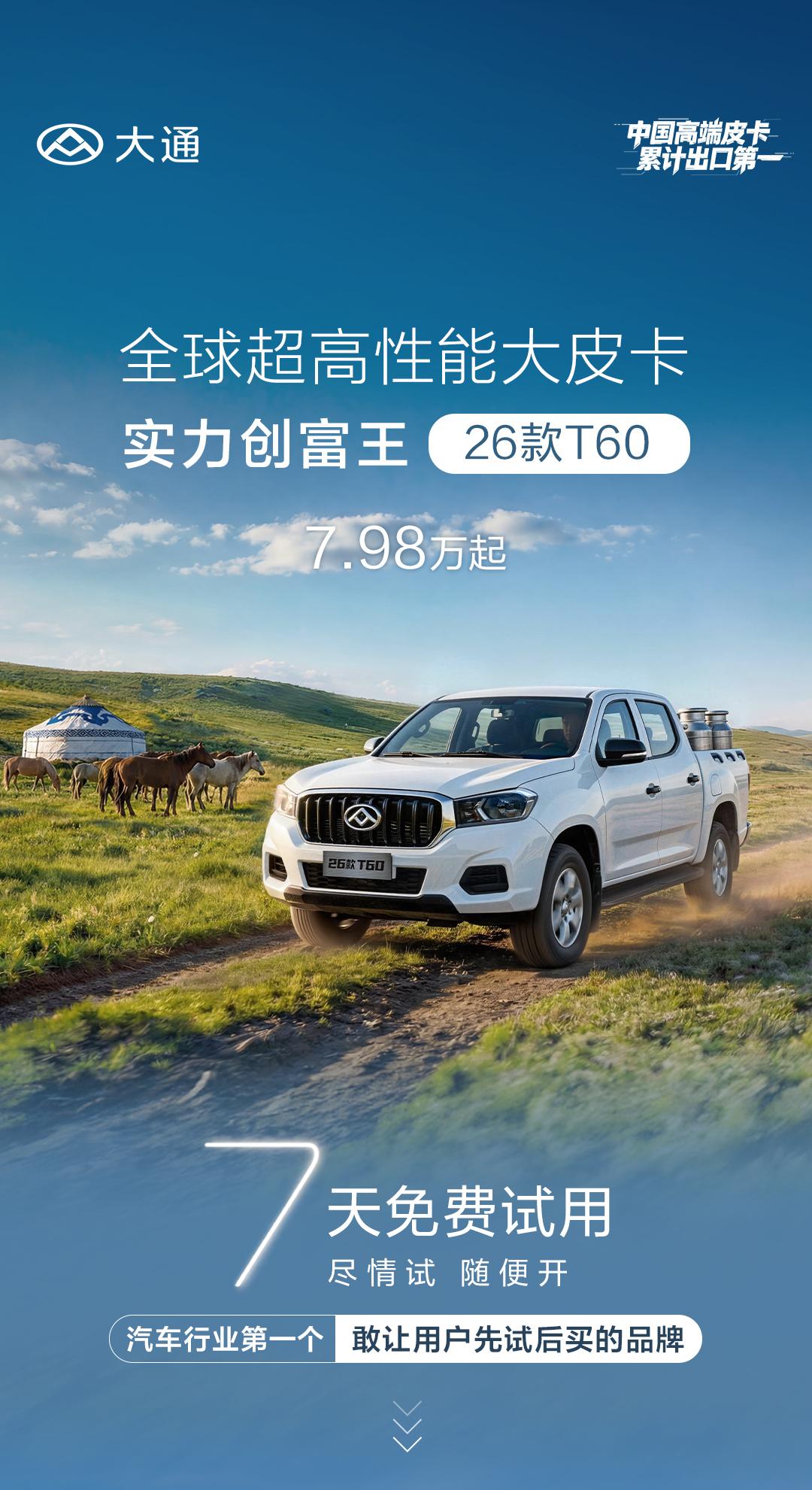7.98万元起、三车齐发、40万辆下线,大通皮卡在下怎样一盘棋? 3月30日,大通皮卡在无锡智造基地搞了个大动作:三款新车同步上市,第40万辆整车下线,还发布了“7天免费试用”模式。7.98万元起售的26款T60、10.88万元起售的全新星际L、24.98万元的26款星际EV,覆盖商用创富到专业作业全场景。 在我看来,三款新车的定位比较清晰:“超级商用王”全新星际L搭载2.5T柴油机,520N·m扭矩、9.6秒破百,柴油皮卡里这个数据能打;“高能作业王”星际EV续航515公里,快充43分钟补能80%;“实力创富王”26款T60则用1.45m³同级最大货箱和十年防腐工艺,瞄准务实用户的刚需。 我更感兴趣的是“7天免费试用”这个模式,在皮卡领域敢这么做的企业不多。毕竟皮卡用户大多务实,与其在展厅听销售讲一小时,不如开回去拉一周货。把选择权交还给用户,这个思路值得肯定。 说白了,大通皮卡40万辆是一个值得尊重的里程碑,三车齐发展示了产品矩阵的厚度,“7天免费试用”模式也值得肯定。大通皮卡下一个十年,关键看这些破局的步子,能不能踩实。 大通皮卡三车齐发