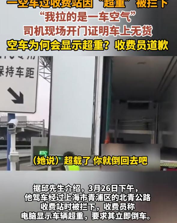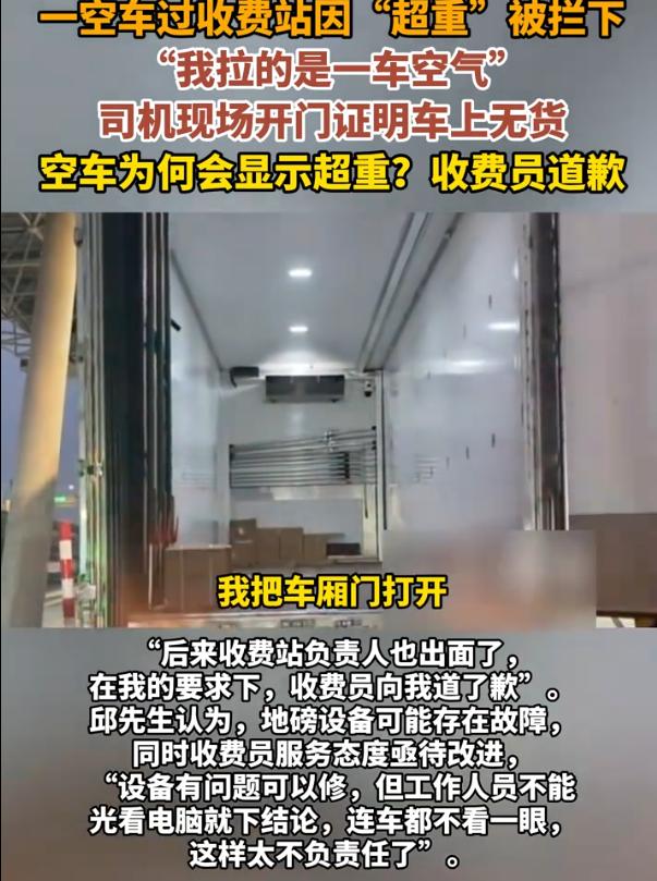 “太离谱!”上海,一男子开着货车经过收费站,称重时工作人员告知车子超重了,男子直接懵了,因为他开的是一台空车,可工作人员坚持以电脑为准,男子选择直接硬刚,当场打开货箱要求工作人员道歉 当天,邱先生这天开着自己的货车,走上海青浦区北青公路收费站,本来想着就是一脚油门的事。结果车刚上秤,收费员一嗓子给他喊住了,超重,倒回去 邱先生当时就愣住了 他这辆车,别说货了,车厢里连个纸箱子都没有,空得能跑老鼠。他试着解释,说自己开的是空车,不可能超重 可收费员压根没给他说话的机会 对方的回应很干脆:我不管你空车不空车,电脑显示什么就是什么 这句话把邱先生噎得不轻。他后来跟人说起这事的时候,还在气头上,你们那个电脑说超重就超重,连车都不看一眼,那我这车到底拉没拉东西,是电脑说了算还是事实说了算? 他没有选择交钱认栽,也没有掉头走人 邱先生直接把车停稳,下车,走到车厢后面,当着收费站工作人员的面,把车厢门拉开了 空的。干干净净,什么都没有 他这一举动,意思很明白,你们自己看吧,看完了再说我超重 直到这时,收费员才绕到车后看了一眼,拍了照片。之后态度才软下来。后来收费站负责人也到了现场,在邱先生的要求下,收费员向他道了歉 可即便如此,邱先生还是把这个事曝光在网上,在他看来,地磅要是坏了就去修,设备有问题可以理解。真正让他窝火的,是那个态度,连看都不看一眼,就一口咬定是他超重,而且是那种不容分说的语气 说实话,收费站的工作人员每天面对成百上千辆车,久而久之容易形成一种惯性思维:系统不会错,数据不会骗人。可问题是,系统是人造的,设备是会出毛病的,数据也是会出错的 当一个人把“电脑显示的”当成唯一标准,甚至懒得去核实一下眼前显而易见的事实,那这就不是设备故障了,是工作方式出了问题。