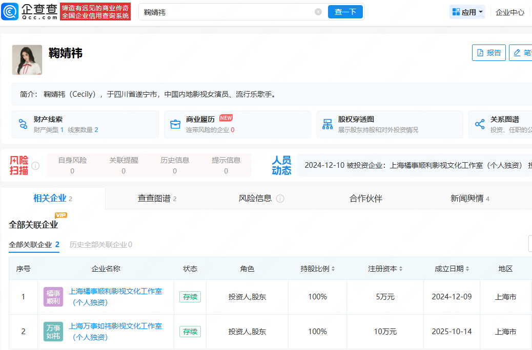 【鞠婧祎名下关联两家工作室】近日,鞠婧祎被实名举报偷税漏税称其申报了1100多万,但实际收入有5000多万,瞒报比例将近88%。据企查查,鞠婧祎名下关联2家企业,分别为上海橘事顺利影视文化工作室(个人独资)、上海万事如祎影视文化工作室(个人独资),均由鞠婧祎担任投资人,持股比例均为100%。 鞠婧祎 收入明细