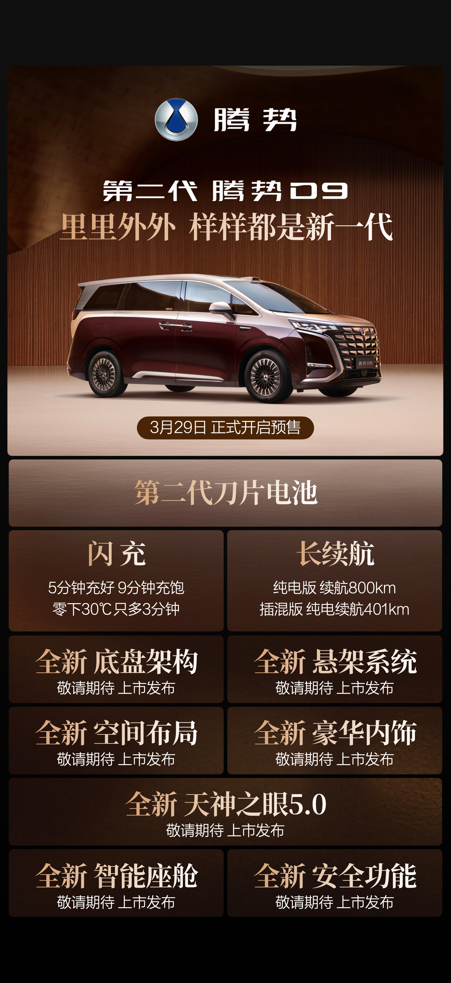 第二代腾势D9预售开启,标配第二代刀片电池、天神之眼5.0,共赠18个月免费闪充
