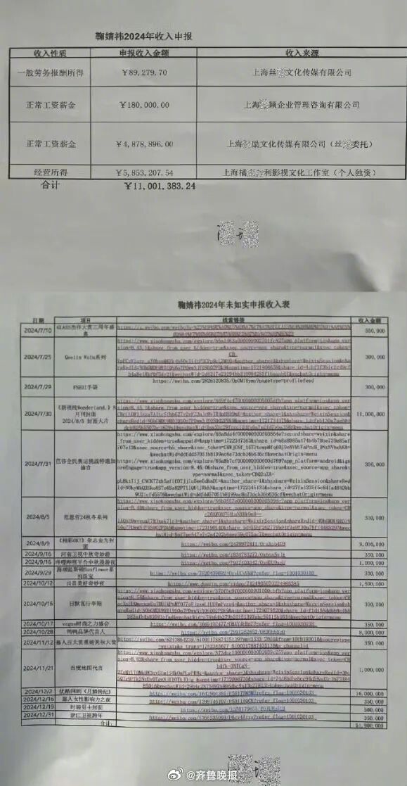 【#举报人称鞠婧祎瞒报比率达88%#】31日上午,三张实名检举税收违法行为的函件在社交平台登陆热搜。函件显示,有人在3月30日于国家税务总局上海市税务局稽查局实名举报艺人鞠婧祎。名为“实名举报信”上的内容显示,实名举报者提到,鞠婧祎在2024年全年申报收入1100余万元纳税,但“仅2024年6月-12月期间,鞠婧祎参加的影视、商务等活动就不下20多项,保守估计收入不少于5000万。”举报人称,鞠婧祎瞒报比率达88%。#鞠婧祎被实名举报偷税漏税#
