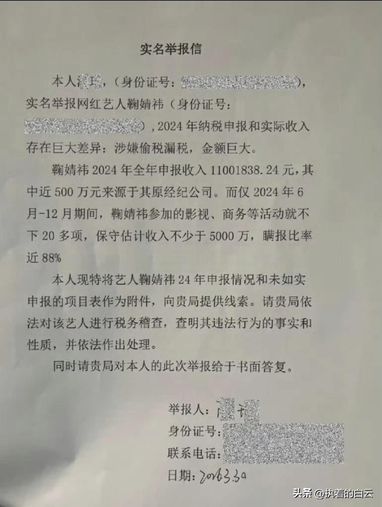 举报人不是别人,正是她的老东家丝芭传媒。举报信里写得清清楚楚:鞠婧祎2024年申报的收入是1100万,但实际收入呢?光去年下半年就参加了20多场活动,代言、演戏一样没落下,保守估计进账超过5000万。这一算,瞒报的比例将近88%!
