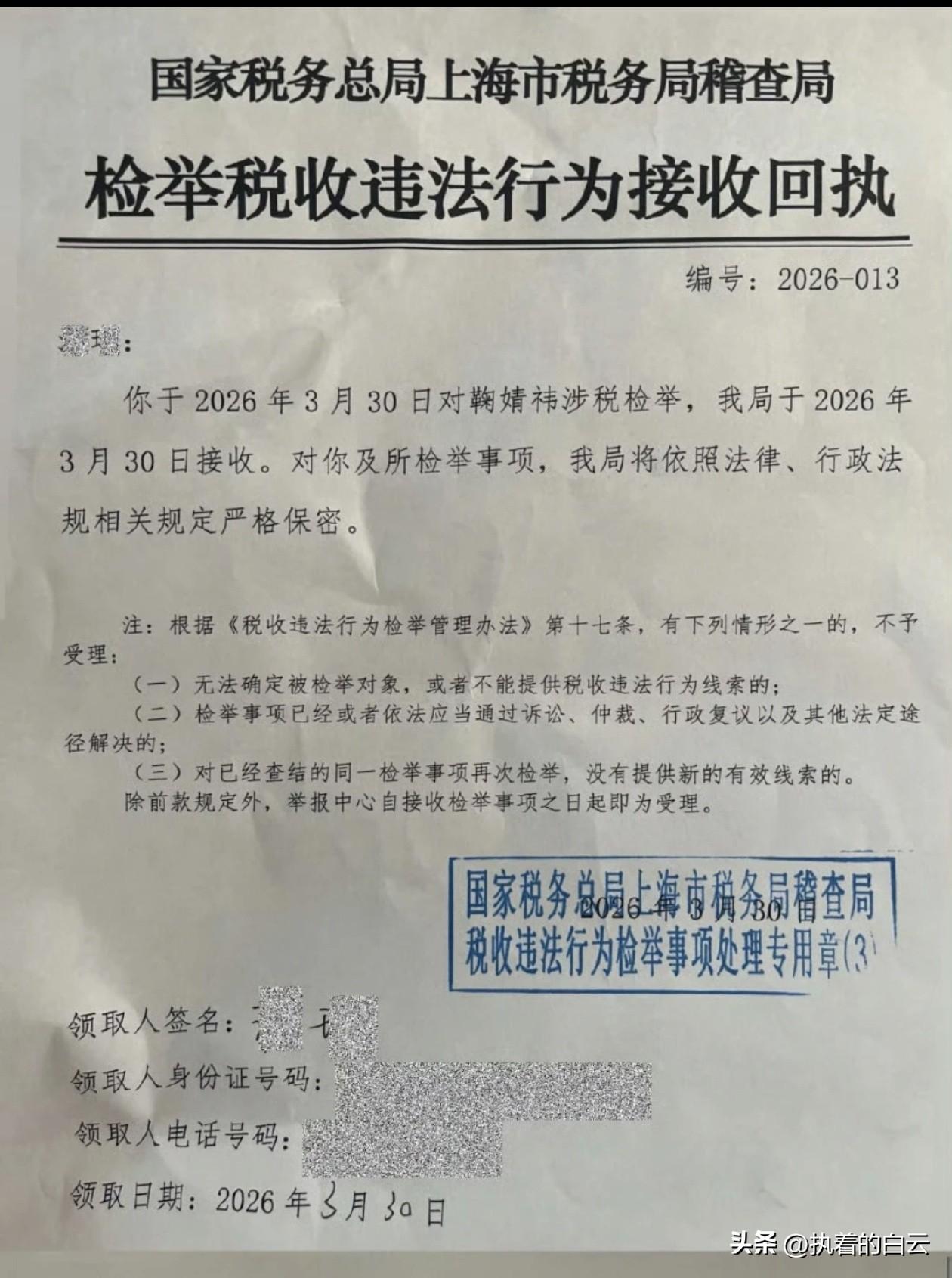 这封举报信是3月30日递到上海税务局的,当天税务局就开了接收回执,表示已经受理,开始查了。