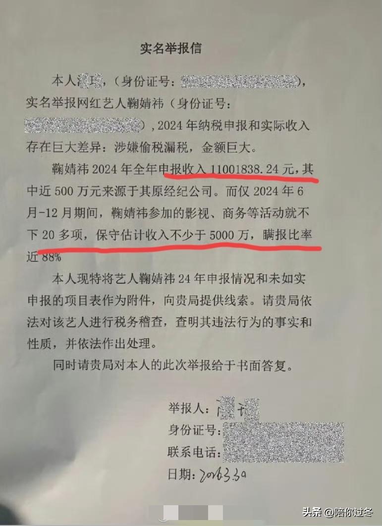 鞠婧祎被实名举报,偷税、漏税! 再爆惊天大瓜,鞠婧祎这下可能麻烦了,偷税漏税可是艺人们的红线,如果实锤不仅可能面临被封杀的风险,还要负法律责任! 3月31日,据大河报新闻报道,丝芭传媒一张实名举报鞠婧祎偷税漏税的信,瞬间点燃整个娱乐圈。 众所周知,双方一直以来都有合约纠纷,甚至还一度闹到了法庭上,但万万没想到的是,丝芭传媒这次直接爆出了鞠婧祎偷税漏税的惊天消息,这事对于艺人来说是致命的,如果实锤那后果不堪设想。 信中明确写道,鞠婧祎2024年申报收入是1100万元,而举报方却声称她的收入已经超过5000万元,瞒报了4000万元,瞒报比例超85%,这个收入比相差甚大呀! 目前,鞠婧祎本人还没有出来正面回应此事,也不知道丝芭传媒的举报是否属实,但是税务部门已经介入调查了,通报结果很快就会出来,真假也会公布出来。大家耐心等待,理性吃瓜!