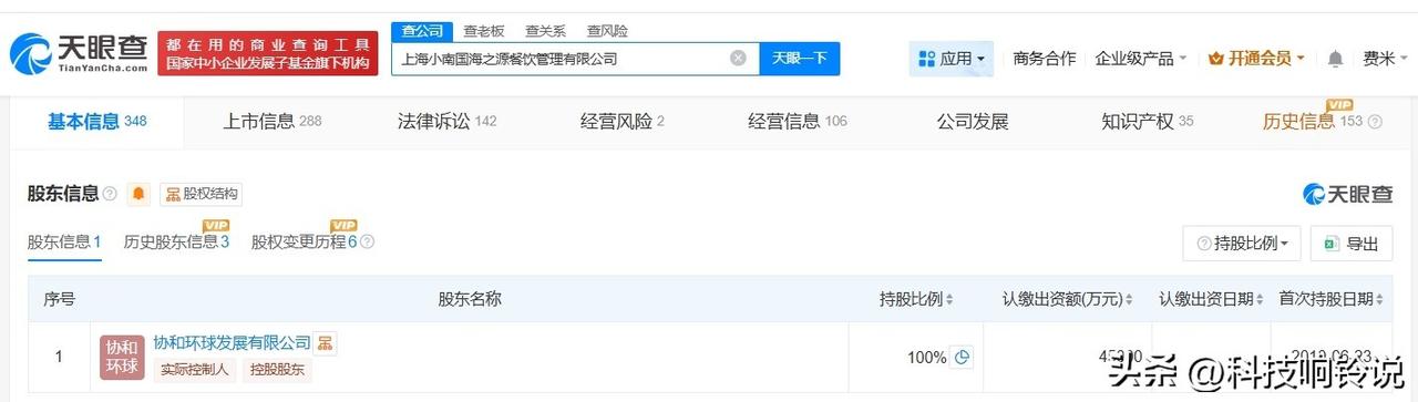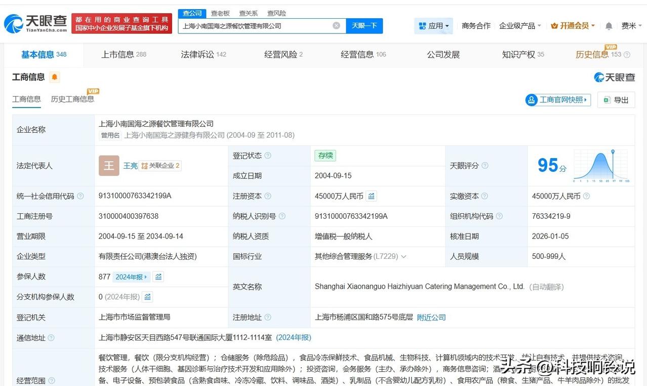 【上海小南国经营异常】 天眼查App显示,近日,上海小南国海之源餐饮管理有限公司因通过登记的住所或者经营场所无法联系,被上海市市场监督管理局列入经营异常名录。 该公司成立于2004年9月,法定代表人为王亮,注册资本4.5亿人民币,经营范围包括餐饮管理、餐饮、仓储服务等,由协和环球发展有限公司全资持股。 据媒体报道,3月31日,上海小南国发布预付卡退费方案,正式委托上海市单用途预付卡协会负责相关退费的登记、公示及处理工作。 天眼查信息: