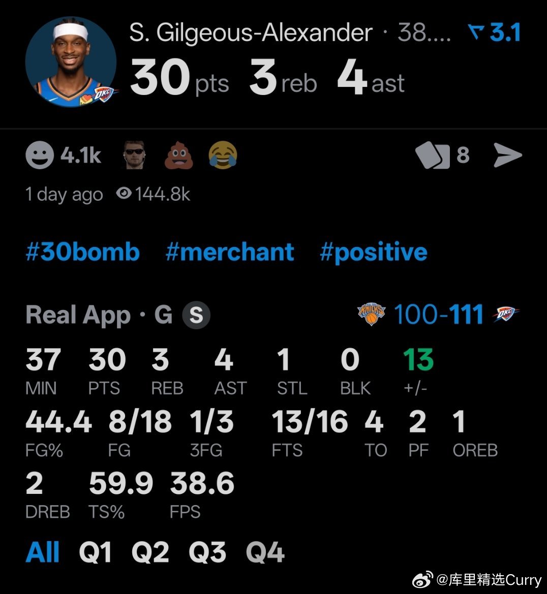 亚历山大近两场比赛场均轰下38.5分,投篮20/37,罚球34/41。雷霆队近1