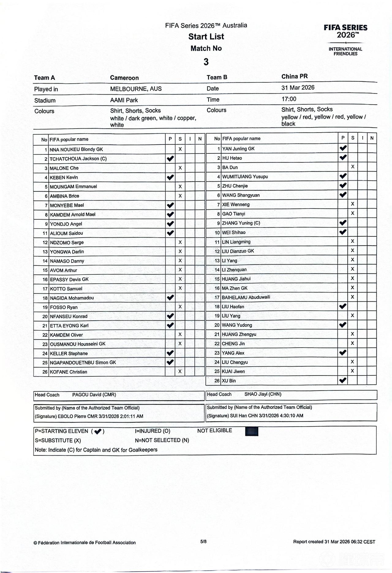 国足今天14点迎战喀麦隆,目前首发11人已经出炉:邵佳一打出541国足邵佳一 阵型 守门员是:颜骏凌。后防线:朱辰杰领衔,加上吾米提江和刘浩帆。胡荷韬,杨希打两个边后卫。 前场:王上源和徐彬组成双后腰,王钰栋,韦世豪打两个边前卫。顶在最前面的是队长,中锋张玉宁