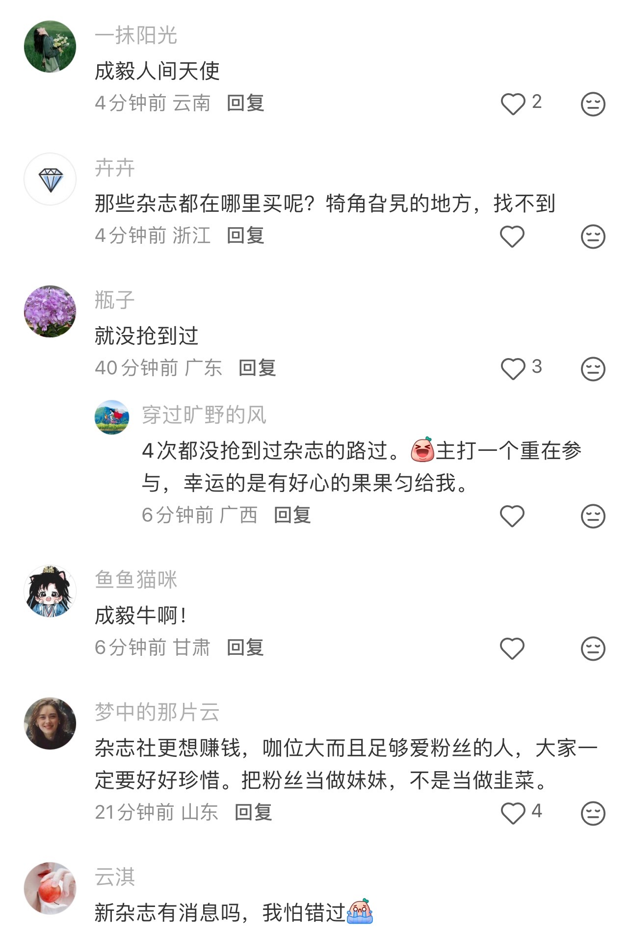 现在粉丝越来越多了,能不能稍微把限量的数量搞多一丢丢。我真怕五代来了我抢不到成毅的杂志
