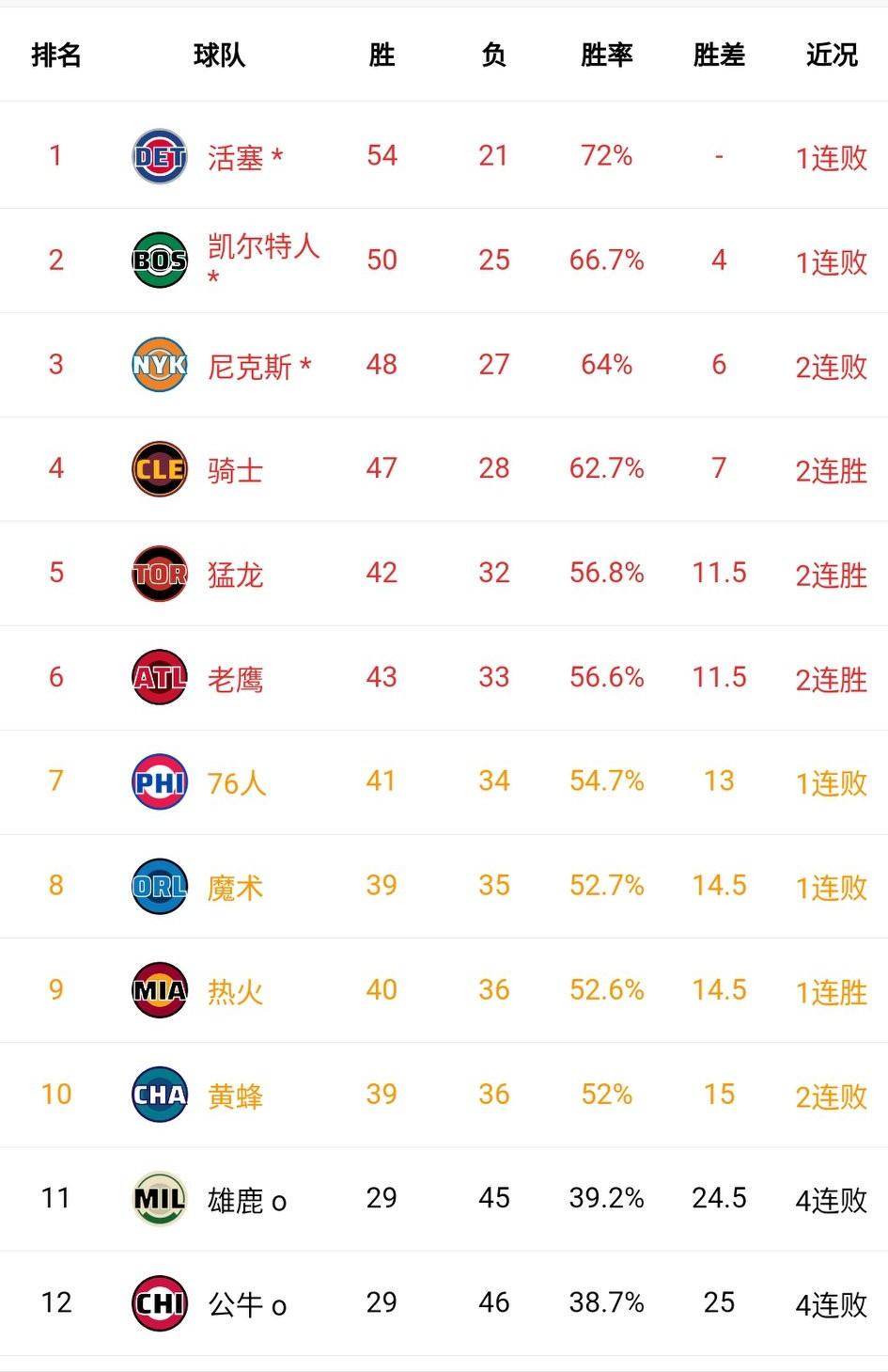 季后赛悬念即将揭晓!东西部前十最终排名基本尘埃落定。 西部前六大概是:雷霆、马刺、湖人、掘金、森林狼、火箭。森林狼和火箭的名次还不稳,就看谁想打湖人。 西部第7-10名:太阳、快船、开拓者、勇士。 东部前六:活塞、绿凯、尼克斯、骑士、猛龙、老鹰。 东部第7-10名:76人,魔术、热火、黄蜂。 东部排名变数太大,5-10名排名可谓一个天上一个地下,他们之间相差太小,一场胜负很可能改变球队季后赛命运。