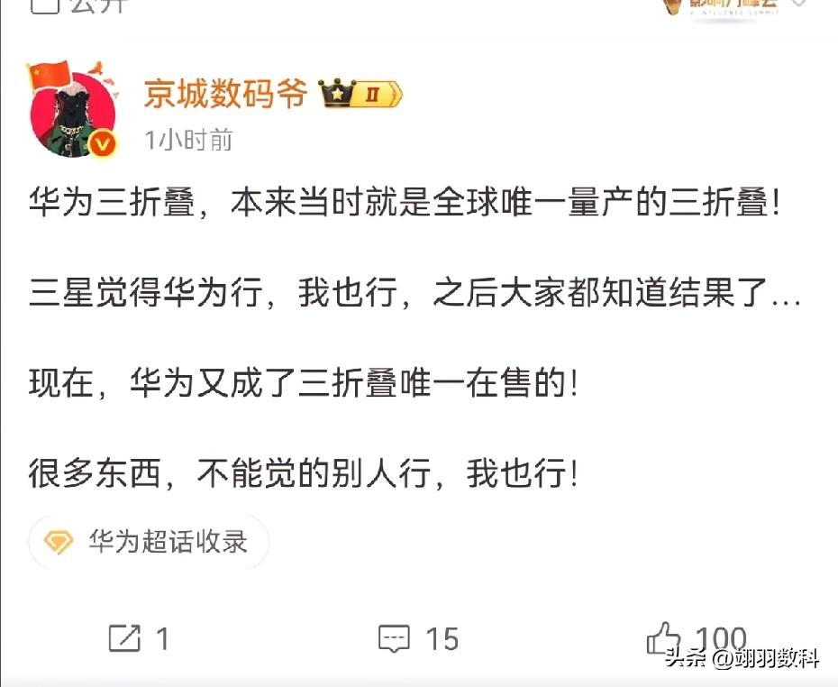 三星三折叠手机已正式停售。原因很简单,看到华为能发布三折叠手机,便觉得自己也可以。 实际上,三星确实具备技术实力,也的确成功发布了该款手机,然而,其整体使用体验、质感和稳定性都比不上华为。 三星这款手机发布后,销量十分低迷,还出现了诸多问题,在这种情况下,三星显然认为这款手机不应再继续售卖,于是选择停售。 相信三星会卷土重来,也肯定会重新推出三折叠手机,毕竟就目前而言,三折叠手机的技术壁垒已不算高。 三折叠时代 三折叠手机 华为手机