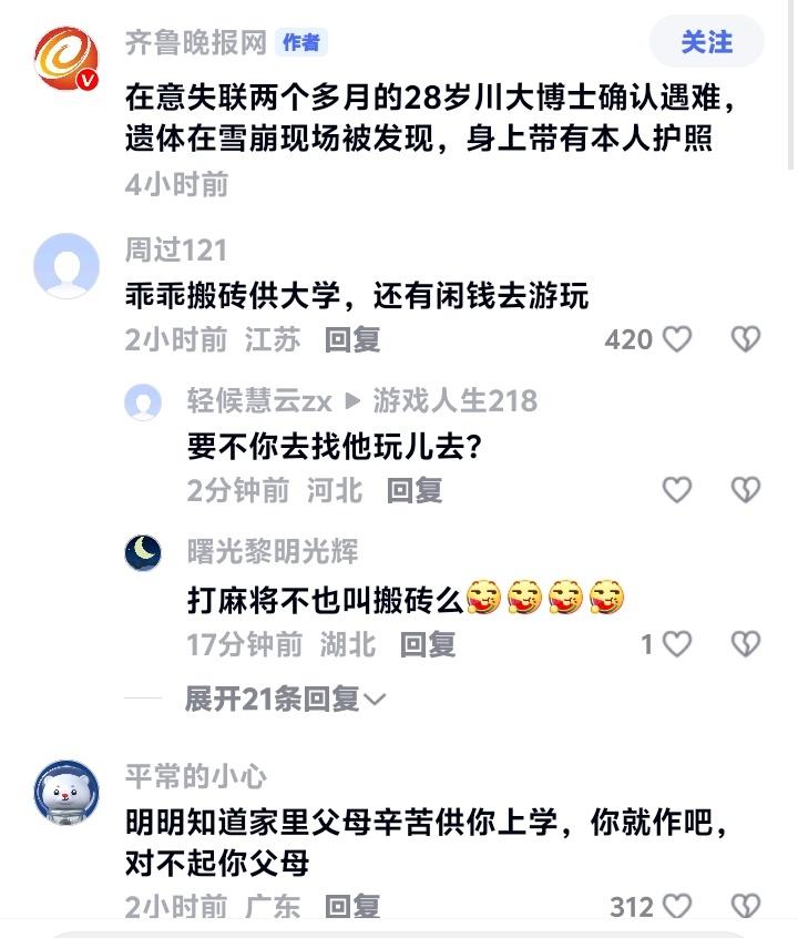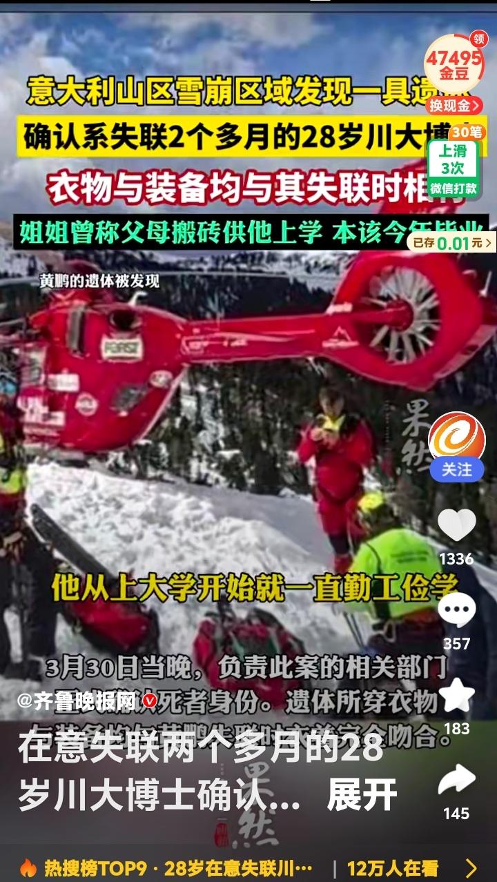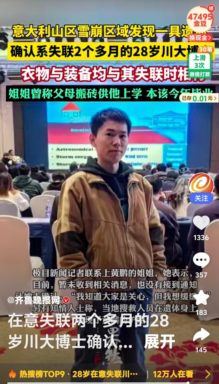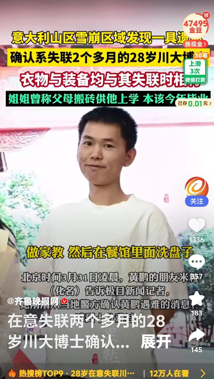 意大利雪山之殇!28岁川大博士魂断异国,父母搬砖供出寒门骄子,节俭存钱圆梦滑雪竟成永别! 那个在意大利多洛米蒂山区富内斯谷的梅兹迪山口被发现的年轻人,身份终于确认。他就是失联两个多月的28岁川大博士黄鹏。衣物、装备、护照,一切信息都吻合,一个年轻而充满可能的生命,就这样被定格在异国的冰雪之中。 消息传回国内,最心碎的莫过于他的家人。姐姐曾含泪诉说,父母是靠“搬砖”供他上的大学。他是全家人的希望,是寒门里飞出的金凤凰。本该在今年毕业,开启崭新的人生篇章,却等来了最冰冷的结局。 据朋友回忆,黄鹏从上大学起就一直勤工俭学。做家教、在餐馆洗盘子……他努力地想为父母减轻负担,也一点点为自己积攒着看世界的资本。他节俭,甚至有些“抠”,但内心却装着对远方的向往。去意大利滑雪,或许是他对自己辛苦多年的一次奖励,一个梦想的兑现。 然而,命运给了他最残酷的玩笑。雪崩区域,人迹罕至,当游客发现他时,一切已无法挽回。我们无从知晓在最后的时刻他经历了什么,是突如其来的灾难,还是对路线错误的绝望?只留下无尽的唏嘘。 网络上的声音却瞬间撕裂。有人冷嘲“搬砖供大学,还有闲钱去游玩?”;有人质问“底层家庭哪来的条件去意大利滑雪?”;更有人直接指责“对不起父母,太作”。这些冰冷的文字,像另一场雪崩,掩埋了基本的悲悯。 我们是否忘记了,一个勤奋向上的灵魂,也有权利追逐自己的星光?他的节俭与他的梦想,从不矛盾。那可能是他规划已久、省吃俭用才实现的旅程。悲剧的根源是意外,而不是一个寒门学子对世界的正当好奇与探索。 黄鹏的遭遇,照见了复杂的人性。有对“寒门”就该永远苦行的刻板绑架,也有对个体生命选择缺乏尊重的轻率评判。他的离去,是一个家庭无法承受之重,也应是我们社会反思之痛:我们该如何看待努力与享受、责任与自我、苦难与梦想? 愿黄鹏安息。也希望这场讨论能留下更多温暖:对逝者抱以尊重,对努力给予肯定,对每一个平凡人追求美好的微小权利,保有最基本的善意。雪会融化,但有些伤痕,需要更久的时间来愈合。 (来源:综合自极目新闻、齐鲁晚报、相关知情人士采访及网络信息) 寒门博士 生命反思