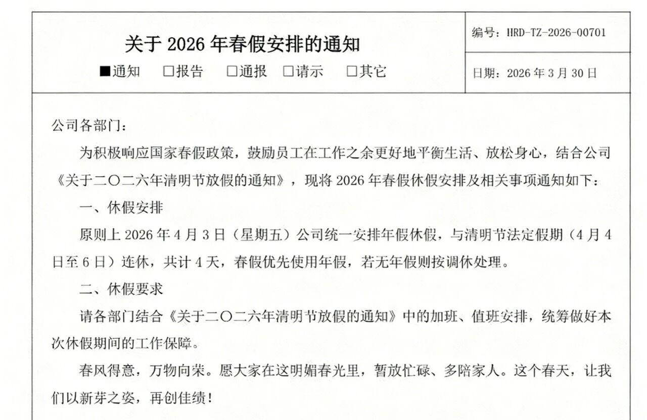 车圈首例!奇瑞宣布放"春假" 今日,奇瑞汽车一则内部春假通知彻底引爆汽车圈与全网职场圈,成为业内热议的焦点话题。作为中国汽车行业首家官宣设立“春假”的车企,奇瑞正式宣布4月3日至4月6日全体员工连休4天,专属春假与清明小长假无缝衔接,超长春日假期直接让企业内部瞬间沸腾,员工工作群秒变欢乐海洋,暖心举措收获全员点赞。 当下汽车行业竞争日趋白热化,行业内卷、加班文化成为普遍现象,奇瑞这一史无前例的操作,堪称车圈里的一股清流,彻底打破了行业固有节奏。业内人士评价,作为自主车企的龙头代表,奇瑞率先推行春假福利,不只是单纯保障员工休息、平衡工作与生活,更彰显出企业发展理念的重要转型——从一味拼产能、拼速度,转向深耕人文关怀,把员工福祉放在核心位置。 其实奇瑞的人性化管理早已落地推进,并非一时之举。董事长尹同跃此前就明确要求“周末禁会、周六不组织公司级会议”,严格严控不必要加班,实打实保障员工休息权利。此次春假正式落地,更是将企业关怀从制度细则落到实处,这份独有的暖心福利,也引发了全行业打工人的集体羡慕,无数网友纷纷喊话自家公司,直言“快向奇瑞抄作业”!