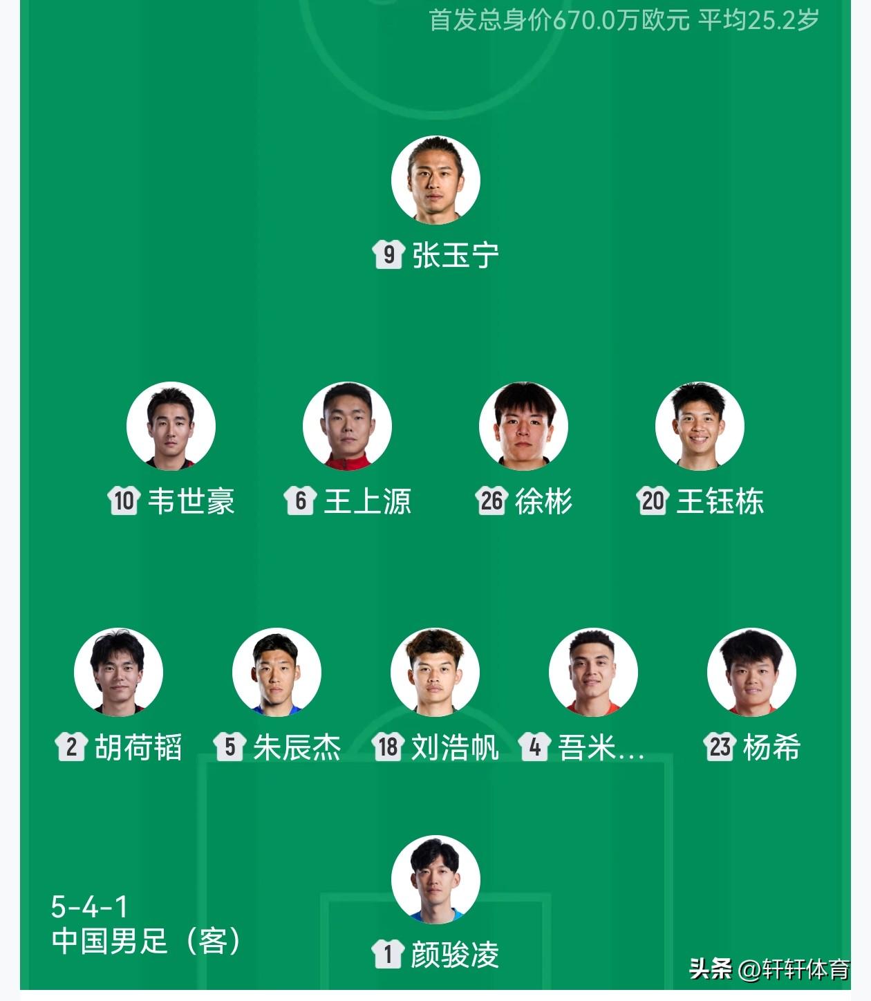 3月31日中国男足对阵喀麦隆首发阵容已经出来了,中国男足本场比赛排出的首发阵容主打5-4-1的防守反击阵型,门将位置依然是国足1号门将颜骏凌,5名后防线人员分别是,2号胡荷韬、5号朱辰杰、18号刘浩帆、4号吾米提江、23号杨希。新4名中场球员分别是,10号韦世豪、6号王上源、26号徐彬、20号王钰栋。单前锋9号张玉宁,本场比赛首发阵容11人名单中,有6名U23球员首发,国足主打青春风暴,目前国足在国际排名第93位,喀麦隆国际排名第55位,本场比赛国足年龄最大的门将颜骏凌35岁,最小的王钰栋只有19岁,中国男足对阵喀麦隆平均年龄25.2岁,对于年轻球员来说本场比赛是难得的与世界强队交手的机会,通过比赛增加经验,同时还能提高阅读比赛的能力,期待国足年轻小将门的出色发挥。