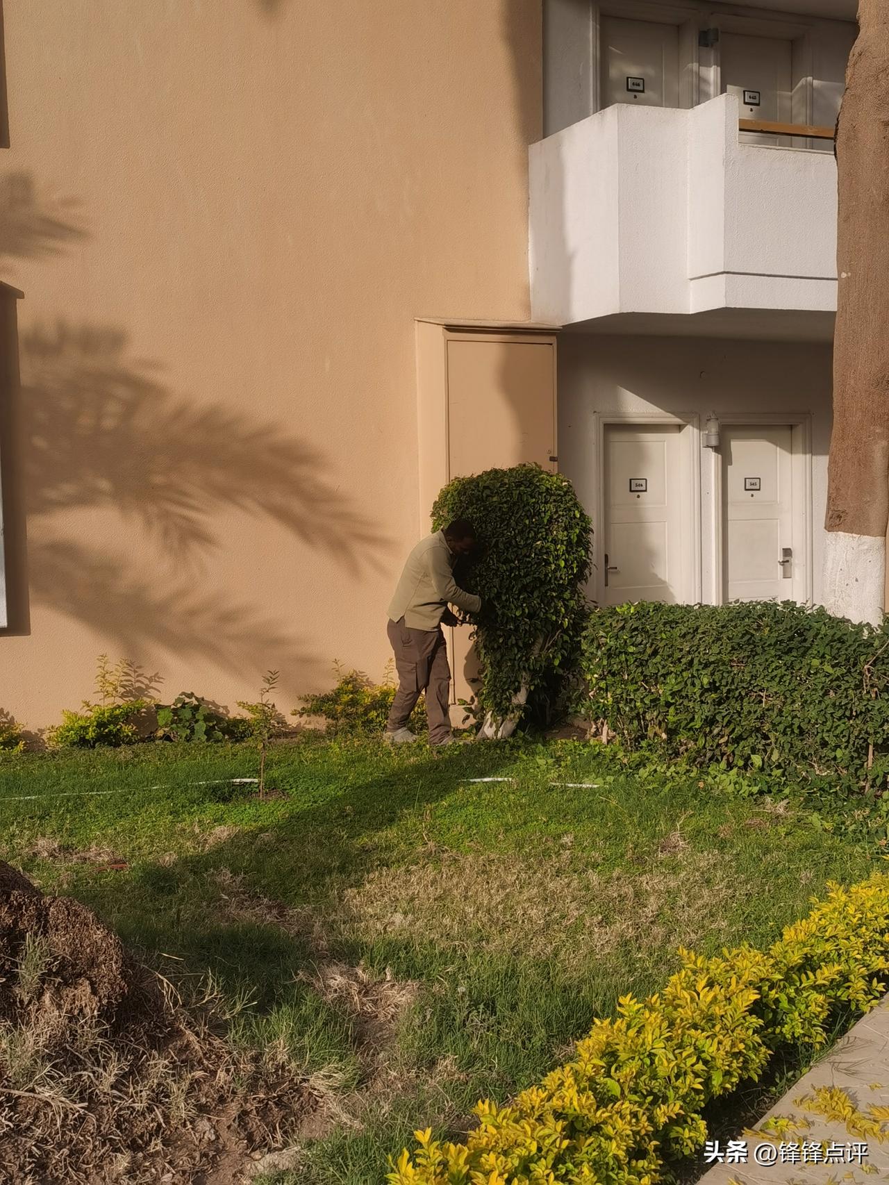 这是我住的五星酒店,独立别墅。五星级酒店见闻 早上吃了早饭我就溜达一圈,看见有绿化工人在干活,裁剪树叶。