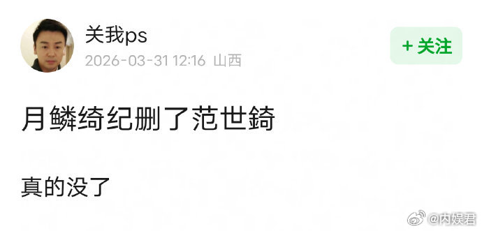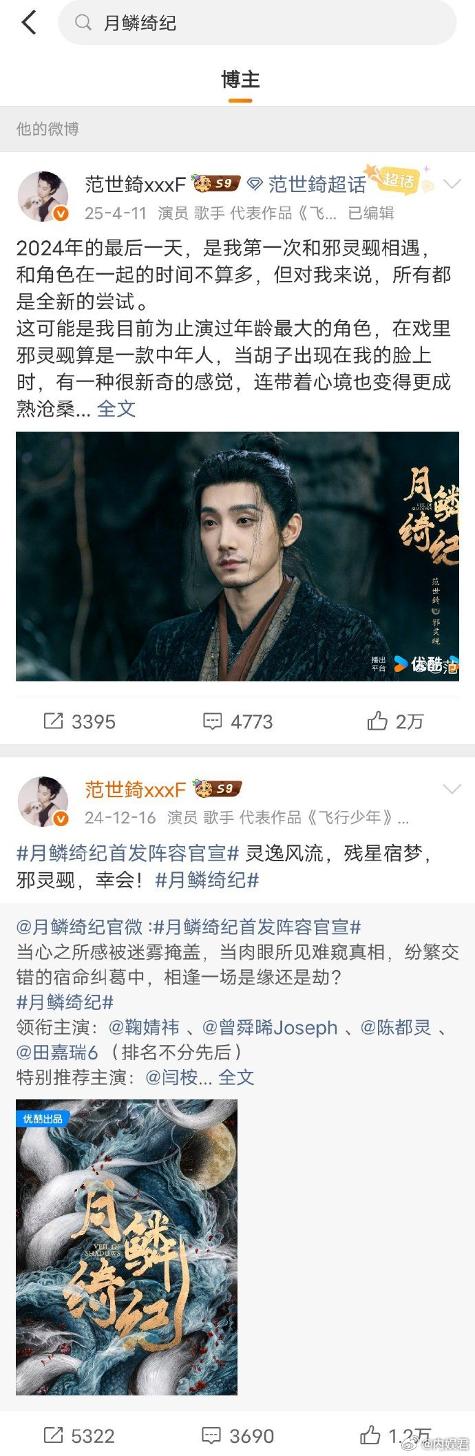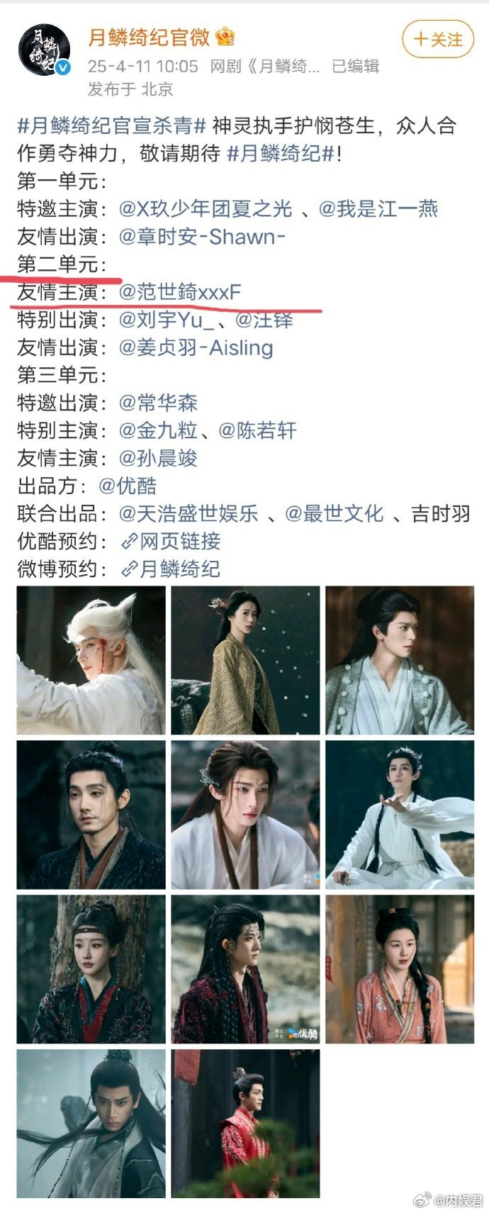 月鳞绮纪定档删了范世錡 网友发现《月鳞绮纪》官宣定档的博文把范世錡的名字删除了,有网友说预告片里还是有的,也有网友说可能会ai换脸,诶其实还蛮期待范世錡邪灵觋的精彩演绎!你怎么看?