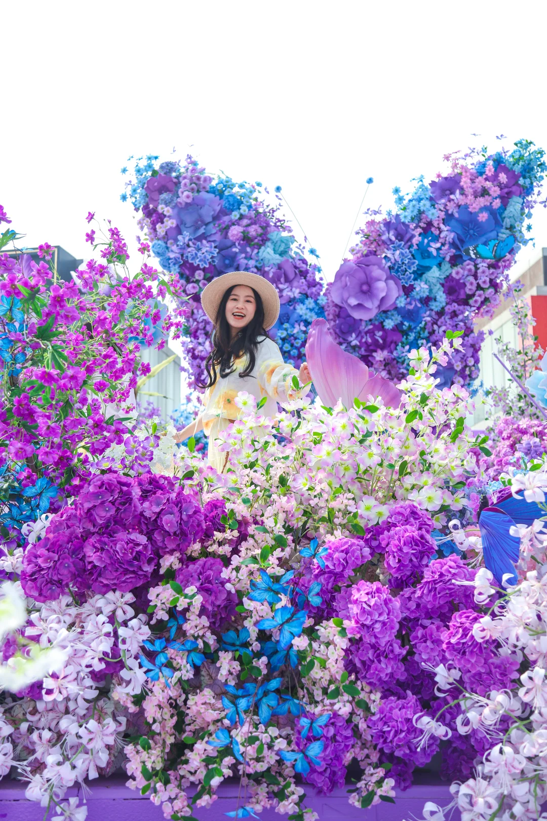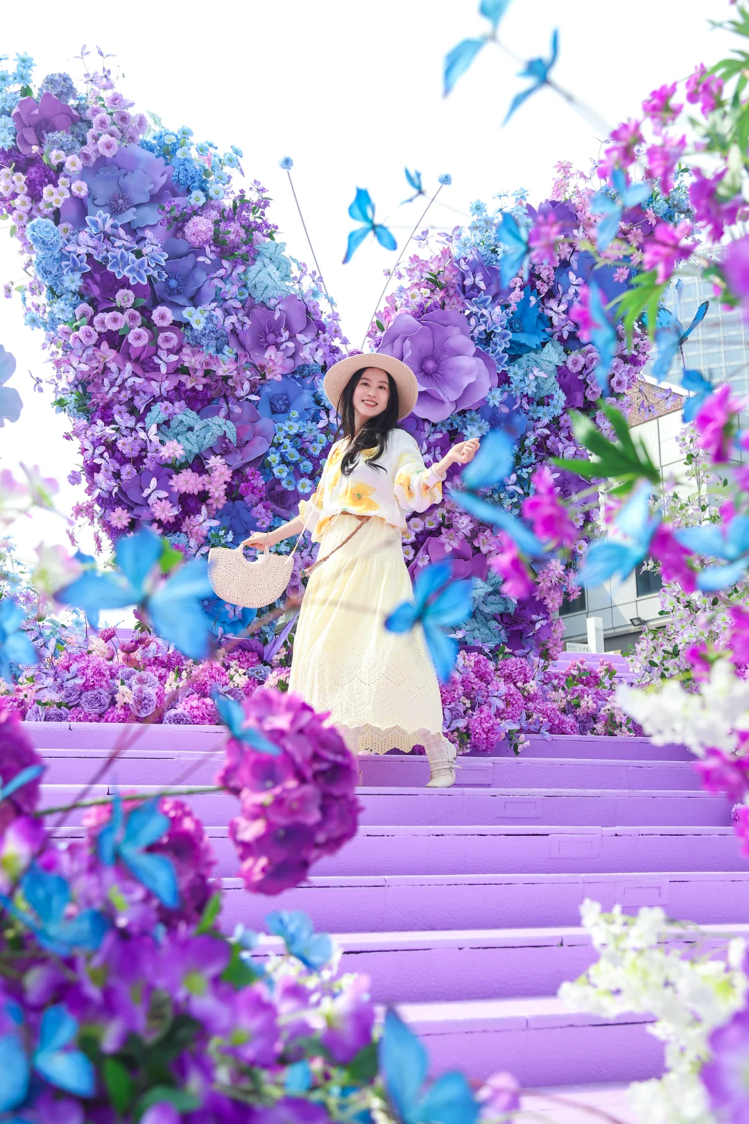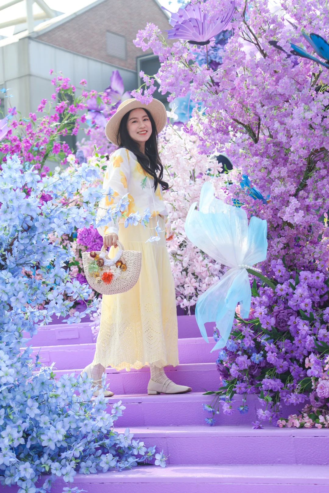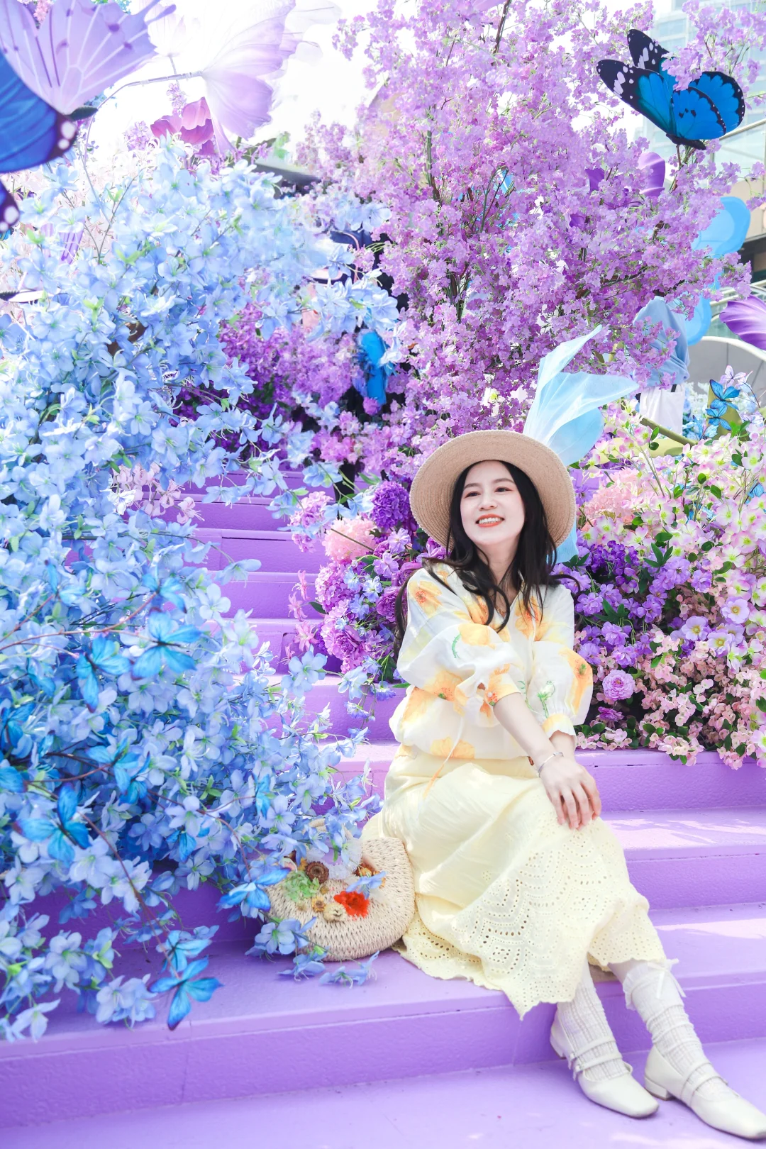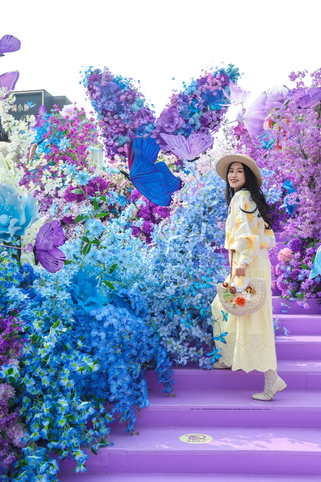 明星花艺师打造的梦幻阶梯,蝴蝶拾级、花瀑漫阶,真的是秒出片,春日氛围感直接拉满💐