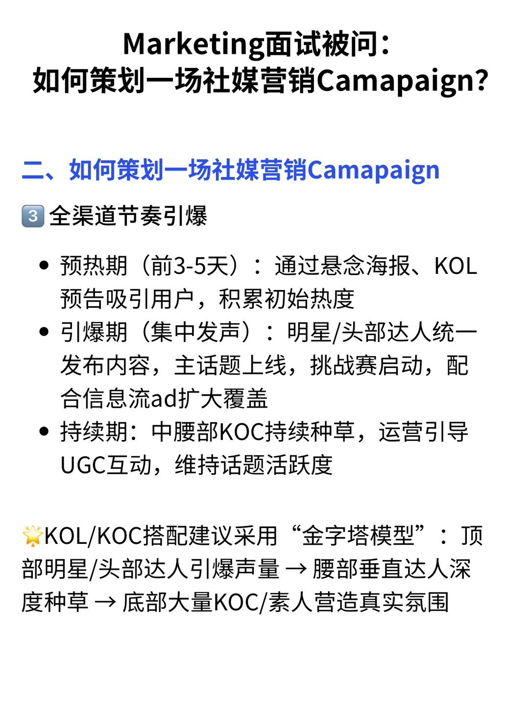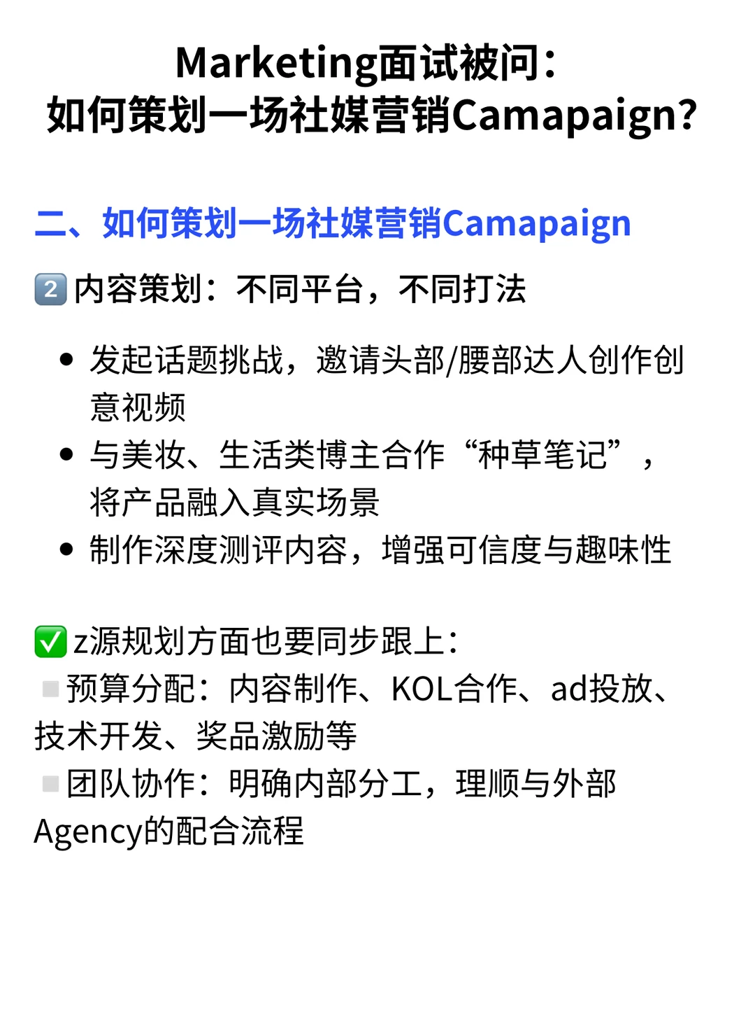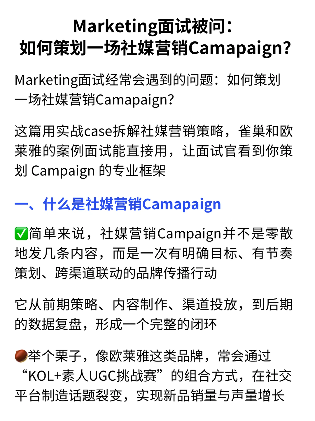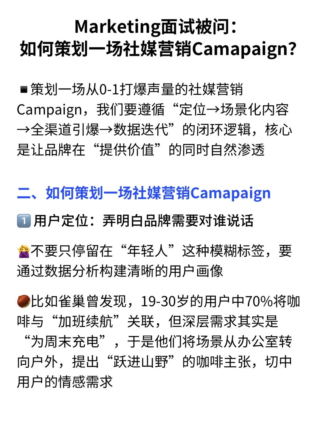 Marketing面试经常会遇到的问题:如何策划一场社媒营销Camapaign? · 这篇通过雀巢、欧莱雅等真实案例,拆解具有实战价值的推广策略,帮助你在面试中展现专业的 Campaign 策划思维 · 一、理解社媒营销 Campaign 的本质 ✅与零散的内容发布不同,社媒 Campaign 是一套目标清晰、节奏有序、跨渠道协作的品牌传播项目其流程覆盖策略制定、内容创作、渠道执行与效果追踪,形成完整的运营闭环♻️ · 🌰例如欧莱雅常用的推广模式,即结合KOL发声与素人挑战赛,在社媒平台激发话题扩散,有效提升新品销量与品牌热度 · ▪️从0启动一场具备爆发力的社媒 Campaign,关键在于贯穿“定位—场景化内容—多渠道扩散—数据驱动优化”的整体逻辑,核心目标是在传递价值的过程中实现品牌信息的自然触达 · 二、如何策划一场社媒营销Camapaign 1️⃣用户定位:弄明白品牌需要对谁说话(详细内容👀见图) 2️⃣内容策划:不同平台,不同打法(详细内容👀见图) 3️⃣全渠道节奏打通&爆发(详细内容👀见图) · 🙋‍♂️(求职版) 💙我是瑞池,500强外企总部Leader+面试官 -