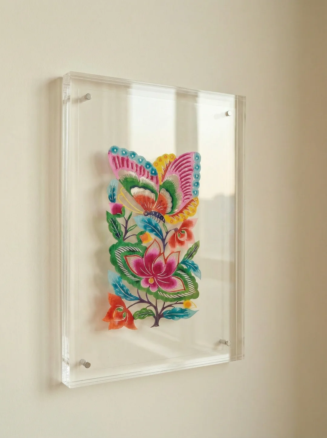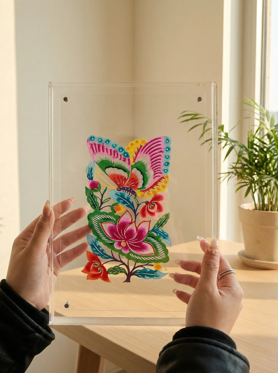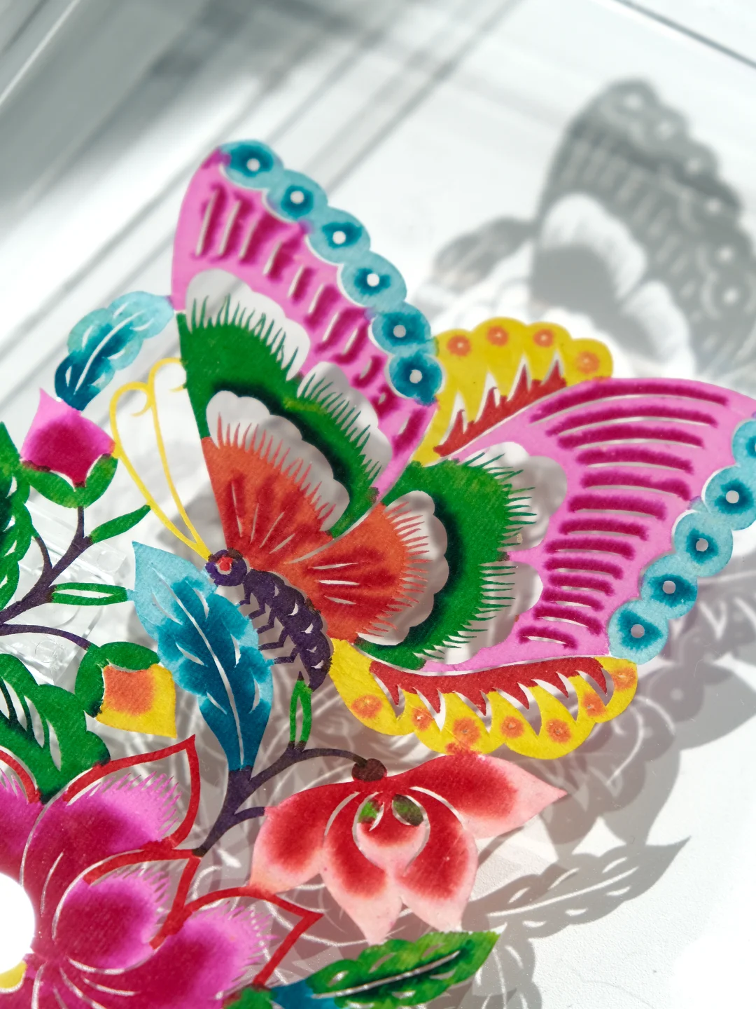 不用剪刀而是刻刀 图案生动又立体 最精细的地方达到了毫米级 这是来自中国蔚县的剪纸 有着600多年的历史 别人的剪纸是单色 而它则是目前唯一以阴刻为主的点彩剪纸 我们把它从原始的图案 做成了可挂在家里的装饰画 精美程度看图可见!! 蝴蝶寓意生机与活力 放在桌上妥妥艺术品级别 因为受欢迎程度不佳 这一批售罄后 就不会补了....