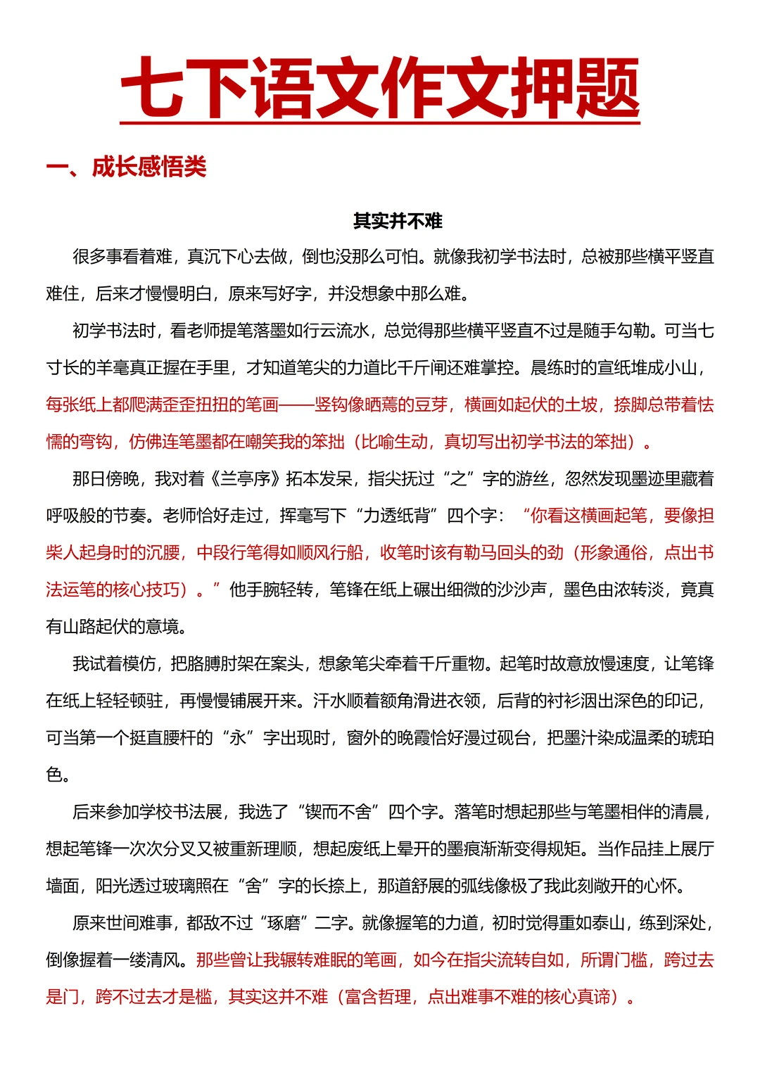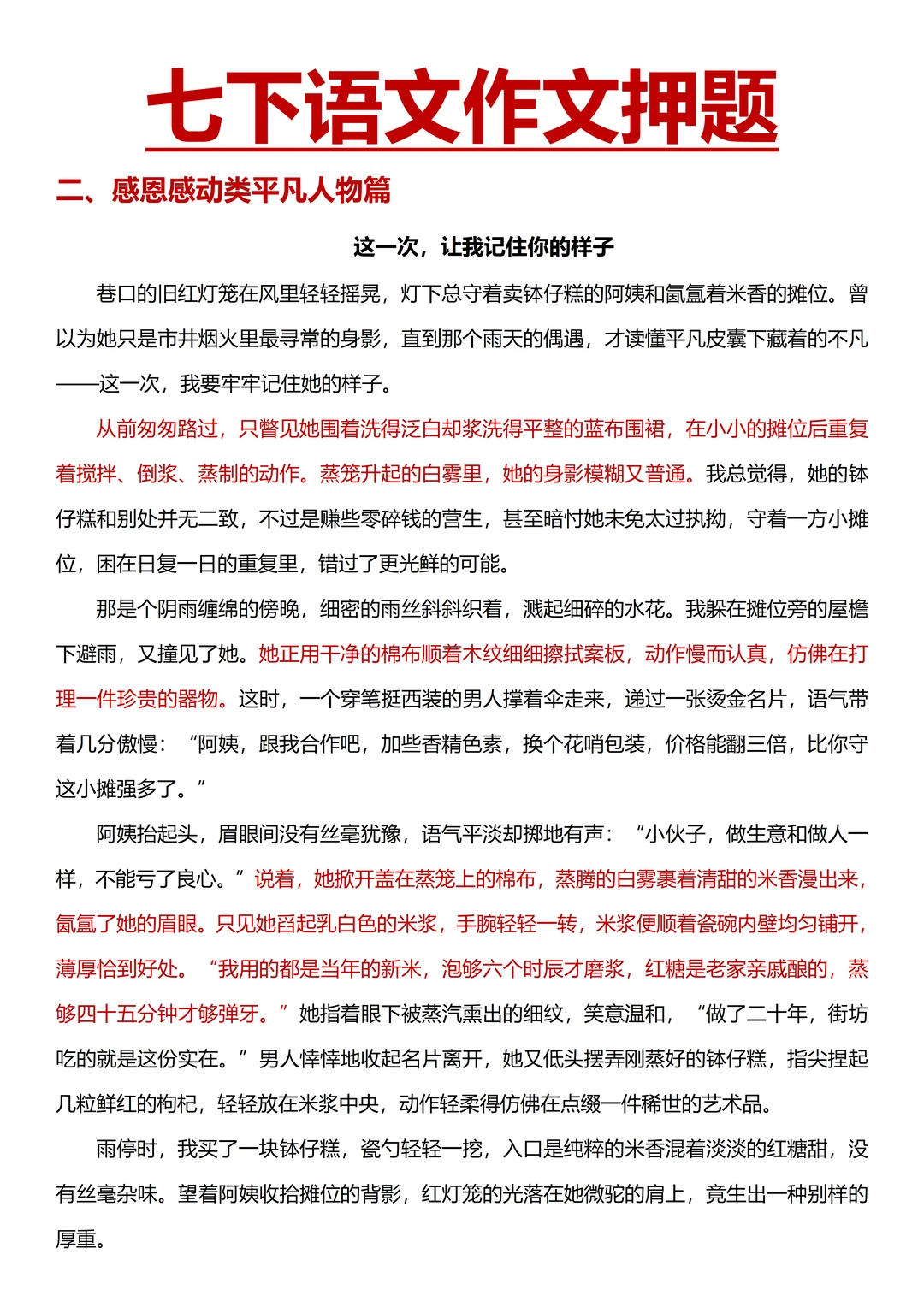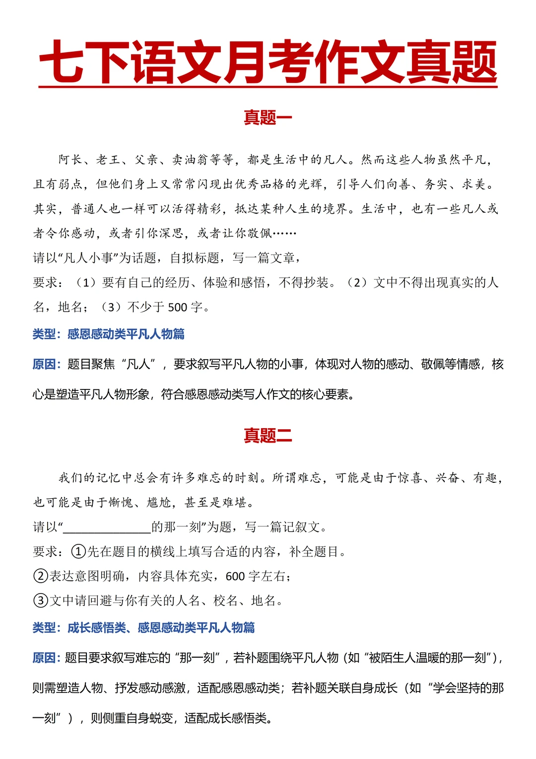 积累成长感悟类、感恩感动类平凡人物篇素材;参考高分范文拆解思路,模仿写作手法和结构,提前准备好自己的一类文;做 5 道经典作文真题审题训练,列提纲对照检查; 蕞后用 3 套模拟卷进行完整检测,批改后分析错误原因,针对性复习,做好总结,为第一次月考蓄力~