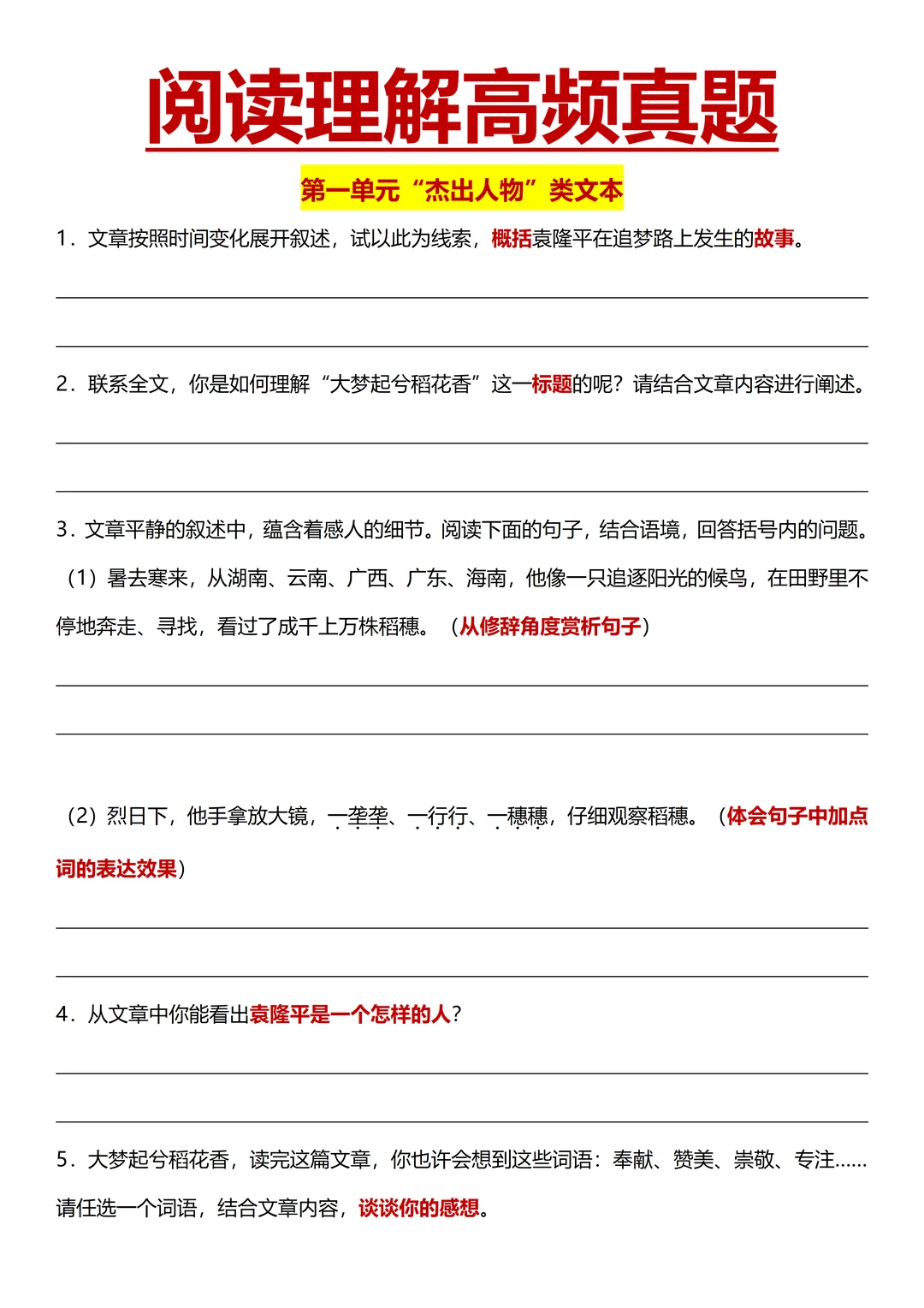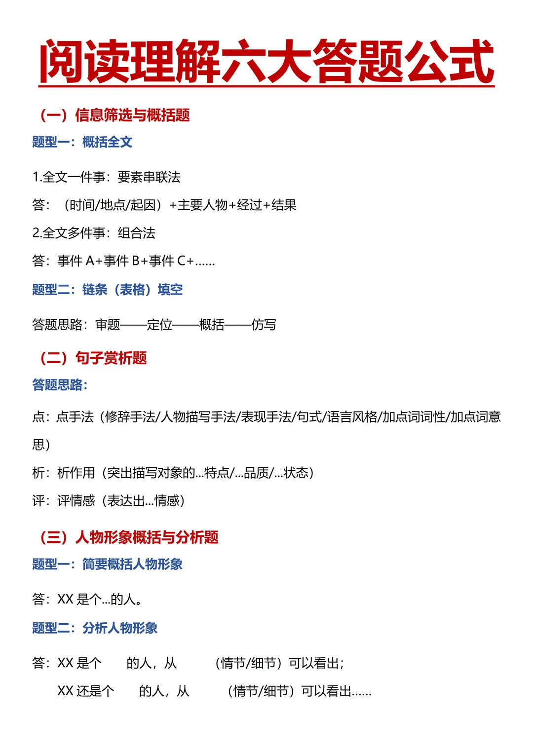 背诵文学性文本阅读理解六大答题公式,限时做 2 篇“杰出人物”单元类文阅读、2 篇 “家国情怀” 类文阅读训练,对照答案整理思路方法;学习非连续性文本阅读技法,完成 2 篇此类阅读,总结错题原因和技巧。