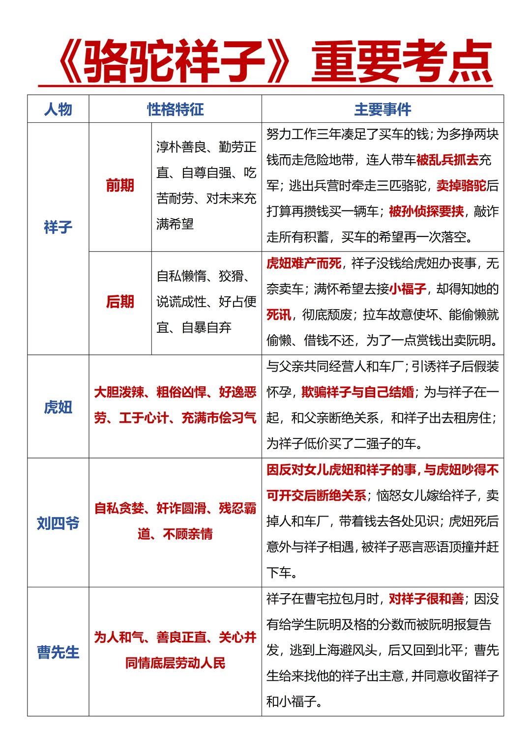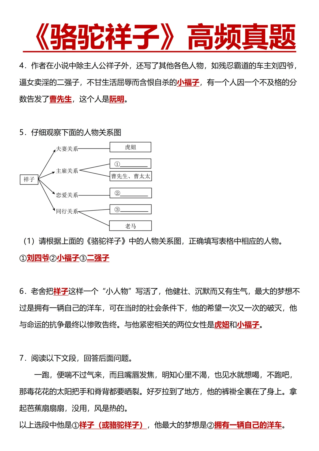 了解《骆驼祥子》写作背景;记三起三落等重要情节,祥子、虎妞、小福子、曹先生等 重点人物形象及对应情节,用自己的话复述;完成名著高频真题,巩固知识。